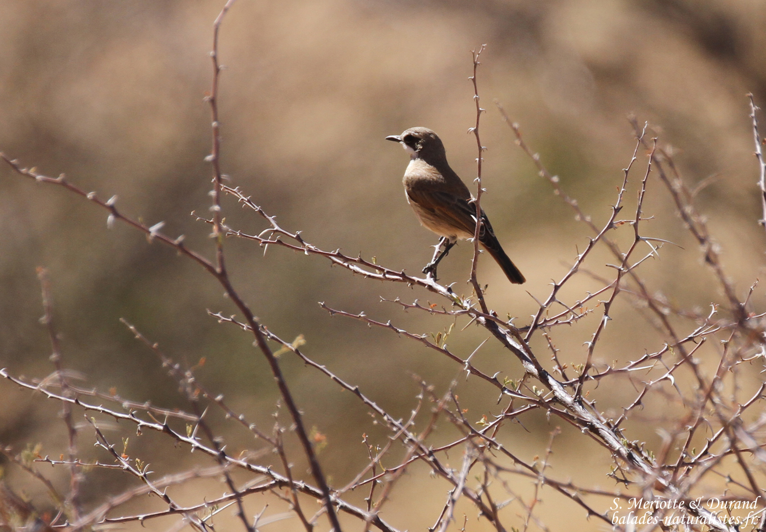 Un rapace cercle, coup de jumelles et non ce n’est pas une Buse augure, autre spécialité namibienne dont l’aire de répartition commence ici. C’est tout simplement un Aigle botté, une espèce que l’on rencontre assez facilement en France. Dans le fond d’un talweg envahi de buissons, deux oiseaux noirs et blancs filent comme des flèches. Un couple de White tailed Shrike, une pie-grièche rondouillette à queue courte. Les Bruants sont également nombreux et on peut en observer plusieurs espèces comme le Bruant du Cap et le Bruant des rochers.