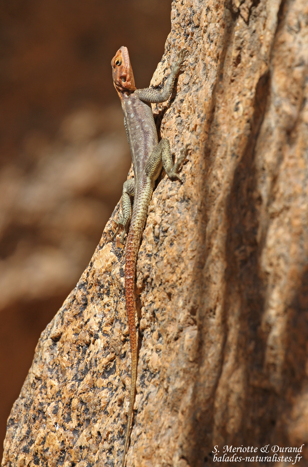 Plus haut dans la falaise, 3 mimétiques Oréotragues gravissent les dernières pentes avant de disparaitre. Vers 11 heures, nous décidons de charger de zone de prospection et choisissons le côté sud du dôme à l’ouest de celui du Spitzkoppe. Première surprise, des Agames. Héliophiles, ils attendent les heures chaudes pour s’insoler. Les mâles arborent de magnifiques couleurs. Ce sont des Namibians rock Agamas. Véloces, ils se déplacent avec une grande agilité sur les parois verticales des blocs granitiques.