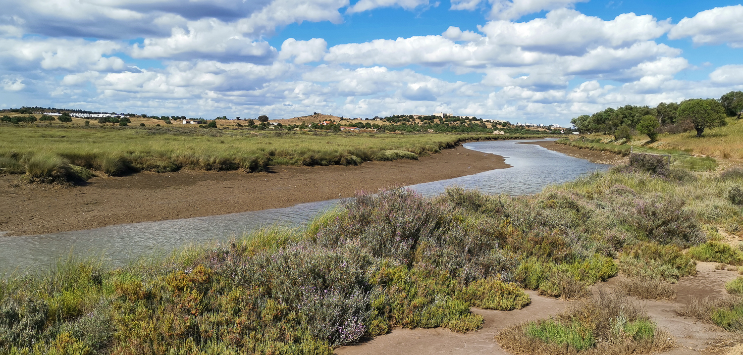 Les prairies alentours sont pâturées par des troupeaux attirant ainsi hérons garde-bœufs et cigognes blanches. Un héron pourpré décolle et passe quasiment au-dessus de ma tête. La piste finit par s’éloigner de la roubine pour longer d’un côté les salins et de l’autre des champs d’oliviers. Un oedicnème criard pousse au loin un cri strident tandis que des flamants roses, les seuls que j’observerai en Algarve, s’alimentent dans les bassins. Un observatoire installé au bord du sentier permet de prendre un peu de hauteur pour contempler le site.