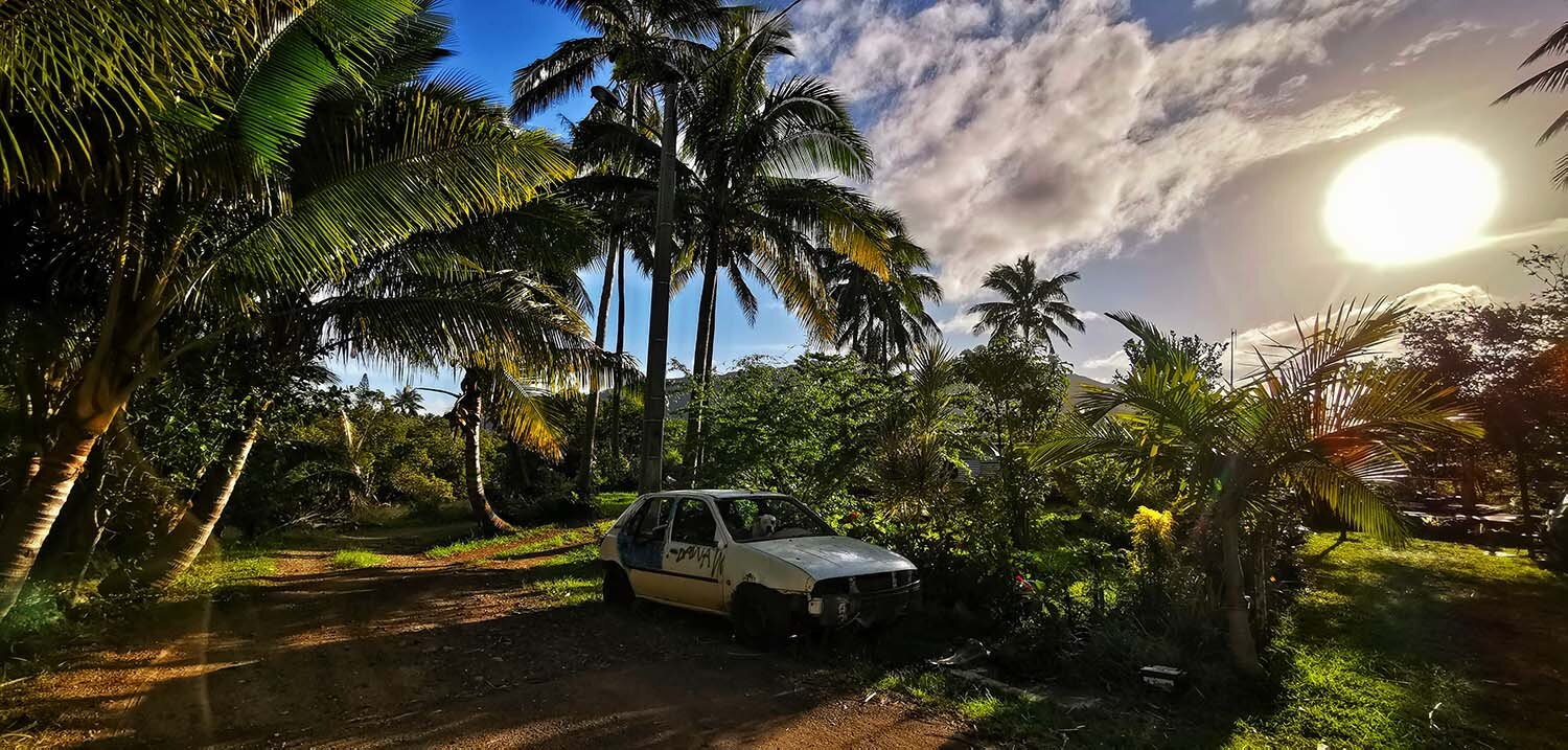 La chaîne trace une véritable barrière au milieu du Caillou. En changeant de côte, on change également d’ambiance et de décor. La transversale longe la rivière Kuenthio au milieu des forêts de niaoulis. Ici, la végétation semble moins luxuriante que sur la Konetiwaka. De plus, les exploitations minières ont laissé de profondes cicatrices sur les sommets alentours. C’est la fin d’après-midi. Le soleil décline à l’ouest et illumine les versants de la route. Le rouge contraste d’autant plus avec la brousse verdoyante.