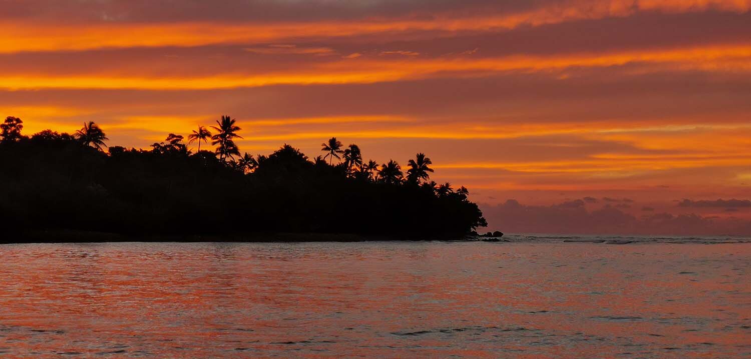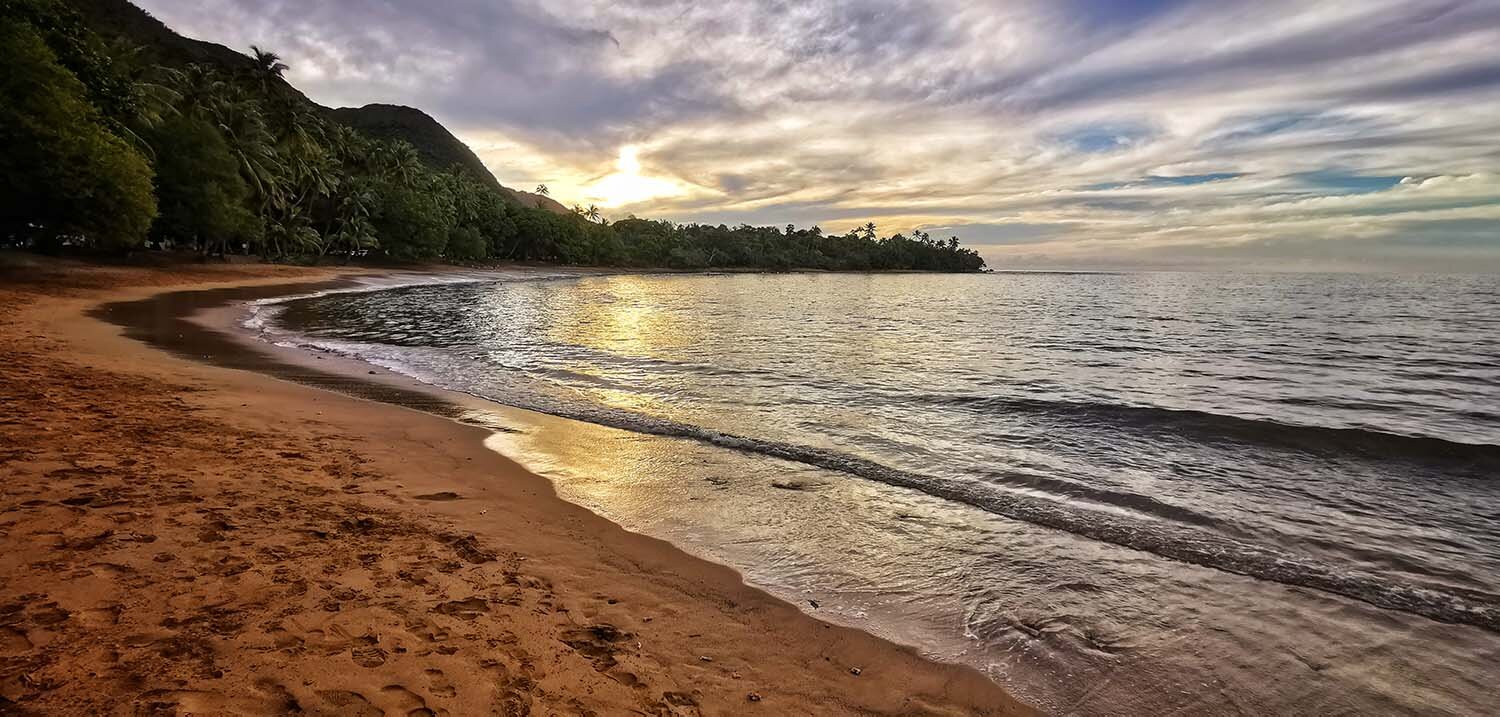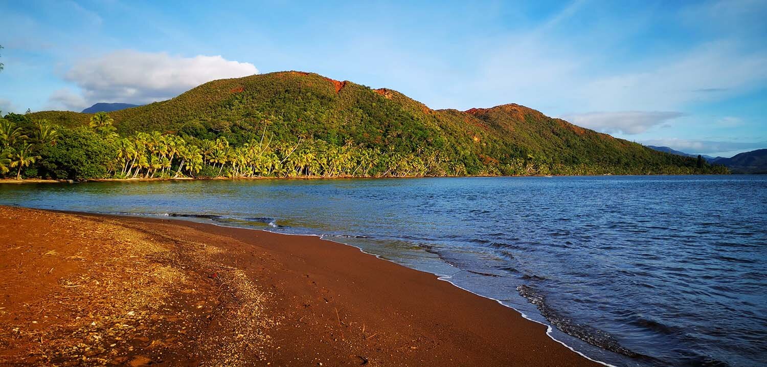 Au petit matin le décor se dévoile enfin : une plage d’un sable sombre à perte de vue bordée d’une frange de cocotiers, des montagnes au rouge vif et, bien-entendu, l’océan se déroulant jusqu’à l’horizon. J’ai un peu le sentiment que c’est ici que nous atteignons les limites du monde. Ou ne serait-ce pas plutôt ici qu’il trouve son origine ? Ici où tous les éléments se trouvent rassemblés ?