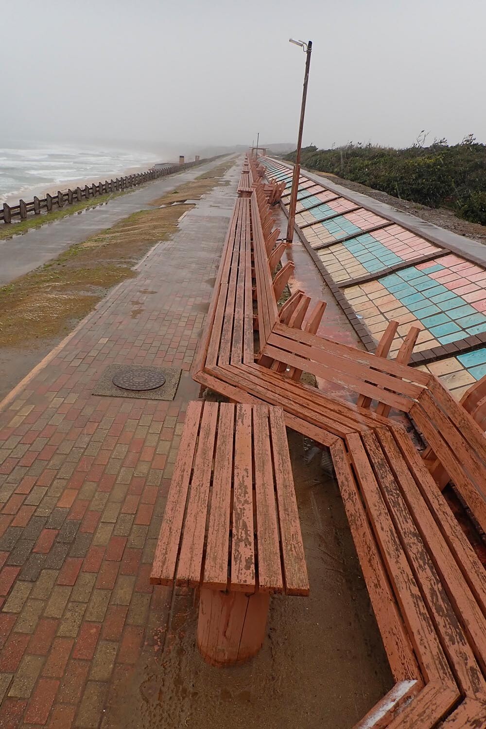 C’est sous un temps vraiment exécrable que je finis ma route jusqu’à Kanazawa. Et pourtant, cette partie ne semble pas manquer de charme ! Malheureusement je me contenterai d’arrêts très brefs ! Il paraît que la plage Masuhaugora est magnifique … sous le soleil. Je me contenterai d’une rapide balade le long de ce qui fut jadis le plus grand banc du monde !