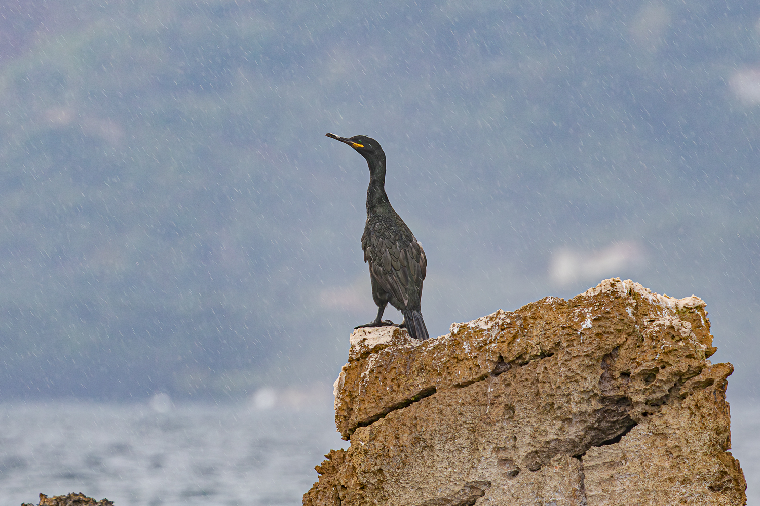 La plupart des bars et restaurants ont fermé leurs portes, les transats attendent la prochaine saison. Seul un cormoran huppé de Méditerranée veille sur son îlot.