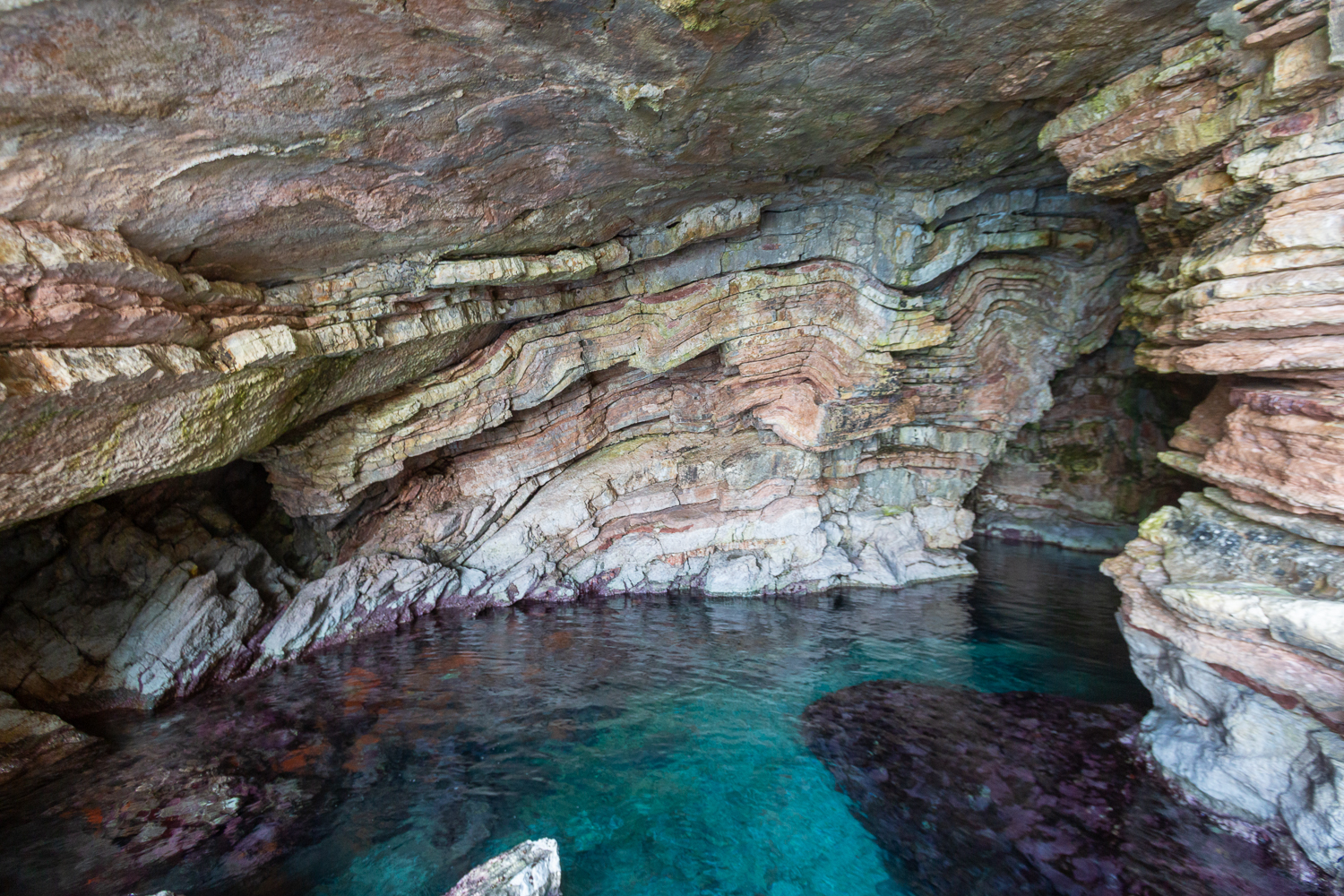 Première escale : la grotte aux tortues, un lieu presque irréel. Les parois mauves contrastent avec les reflets turquoise de la mer.