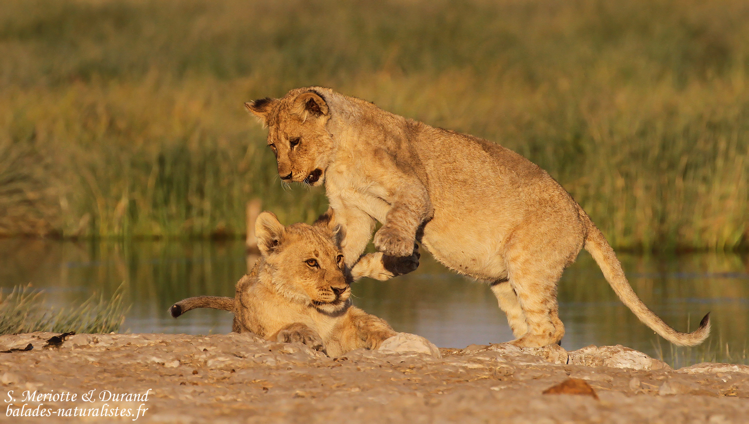 Une femelle tourne la tête à son tour pour les surveiller pendant qu’ils se chamaillent. Insouciants, les deux jeunes miment des attaques, se donnant des coups de pattes, se sautant à la gorge, tentant de renverser l’autre, mordillant la nuque puis l’oreille … ce qui donnent d’excellentes opportunités photographiques. C’est la première fois que nous pouvons réellement observer des interactions au sein d’un groupe familial et cela change des « classiques » observations de lion en train de sommeiller !