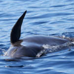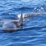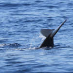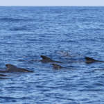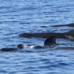 Mais que serait une sortie en mer sans les stenella ? Après avoir quitté les grands dauphins noirs, nous apercevons un important groupe de Dauphins bleu et blanc, ils semblent même être près d’une centaine. En pleine partie de pêche, ils sont peu intéressés par le navire et dédaignent nos vagues. L’heure n’est pas au jeu !