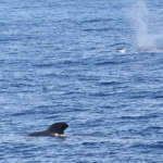 Les Globicéphales sont des animaux grégaires et communiquent sans cesse. Leurs sons audibles depuis le bateau semblent même déranger les autres cétacés. Mais ce n’est pas le cas de ce Rorqual commun qui croise la route des baleines pilotes.