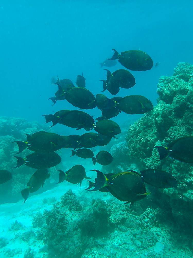 Il ne reste plus qu’à enfiler le matos de PMT et c’est parti pour un petit bain. La marée est à présent basse, le coef fort et l’eau assez trouble, ce qui n’empêche pas d’observer les nombreuses tortues vertes, escortées de leurs rémoras, s’alimentant dans l’herbier de cette zone protégée.
