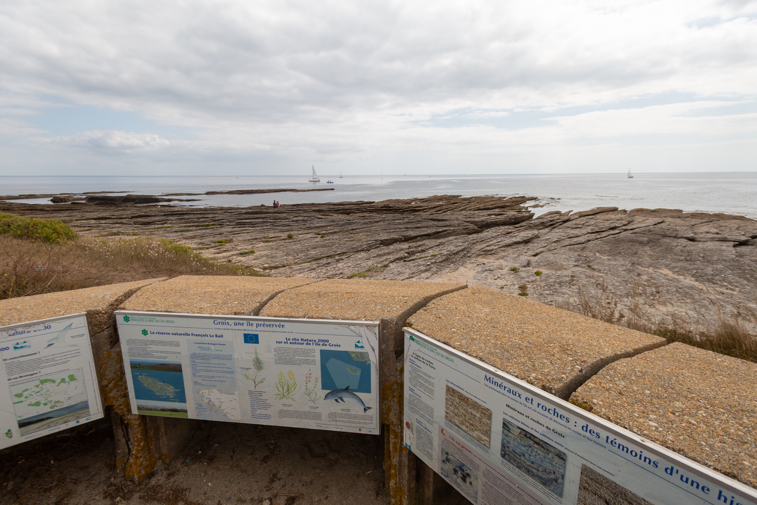 Un huîtrier pies pousse son cri strident avant de s’éloigner. Mais les oiseaux sont assez peu nombreux. Postés depuis la plateforme, j’observe en mer mais ne parviendrai pas à trouver d’aileron. Les panneaux pédagogiques présentent en effet les richesses de l’île de Groix. La zone est classée natura 2000 y compris sur la zone marine et il est possible d’y observer le grand dauphin.