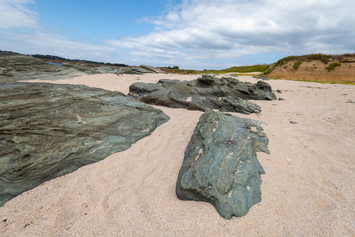 Mais la journée avance vite et nous avons un bateau à prendre. Nous filons jusqu’à la plage de Locmaria. Située sur la côte sud de l’île de Groix, elle offre une atmosphère plus protégée que les falaises exposées de l’ouest. Cette anse sableuse, encadrée par des affleurements rocheux métamorphiques, est le résultat d’un équilibre fragile entre apports sédimentaires et action des houles dominantes. Le sable, majoritairement composé de quartz et de débris coquilliers, peut également présenter des concentrations minérales issues de l’érosion des schistes environnants. À marée basse, l’estran dévoile une mosaïque d’habitats : mares temporaires, zones de galets et herbiers d’algues brunes, favorables à une petite faune discrète (crabes verts, gobies, anémones).