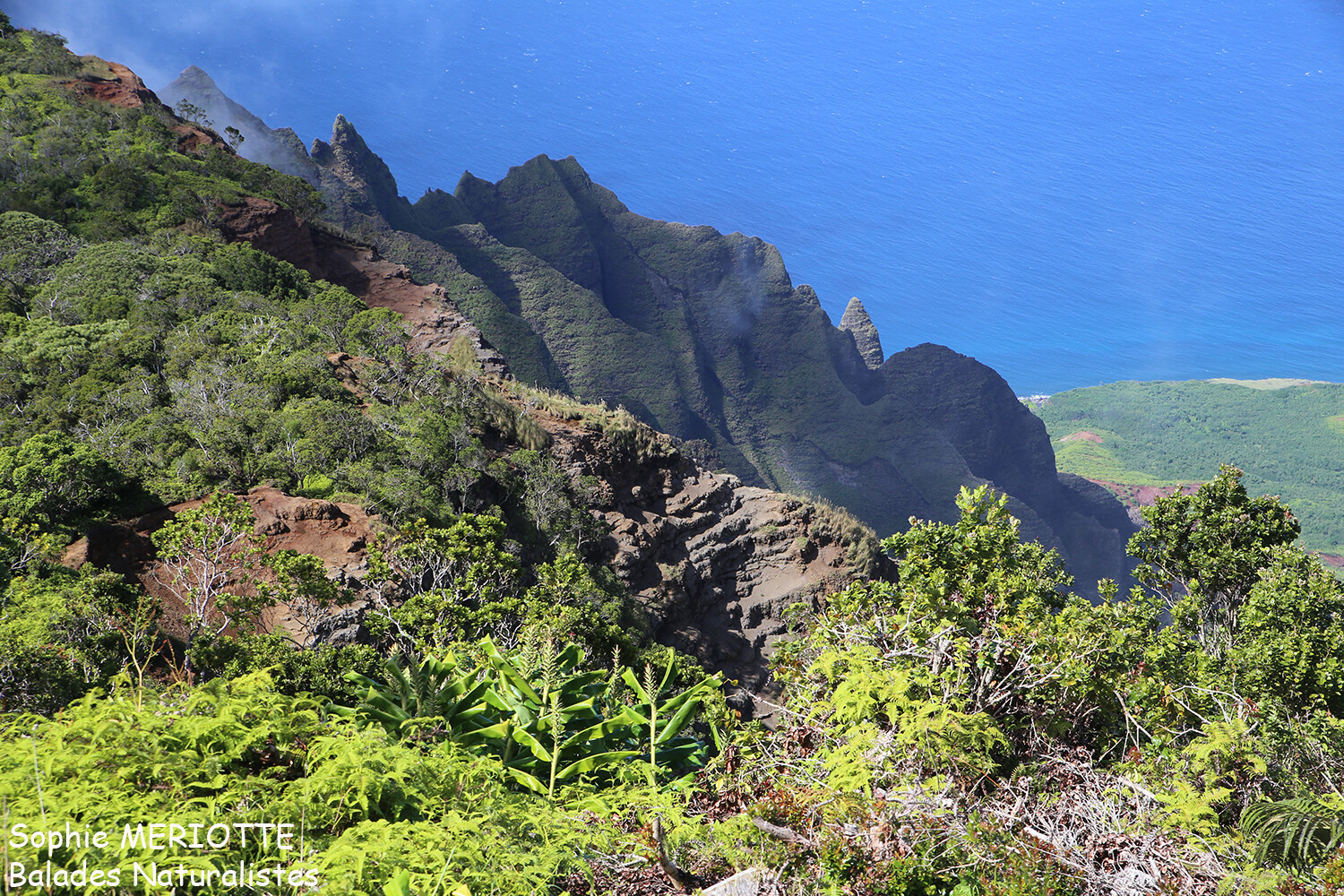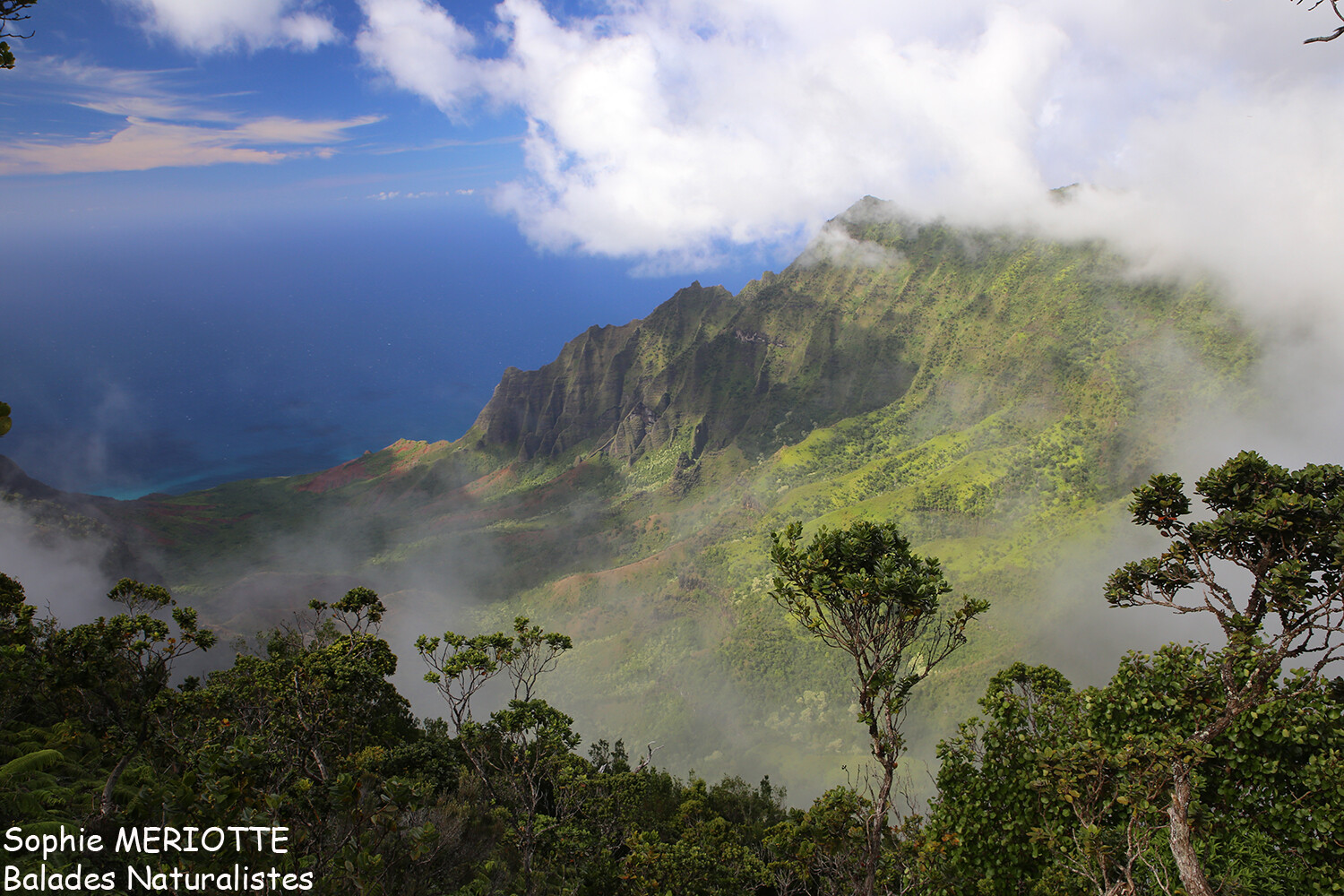 Je termine au bout de la route, au milieu du Koke’e state park, forêt humide abritant de nombreuses espèces endémiques. La brume monte de la mer dévoilant par intermittence le paysage aux allures mystiques de Napali coast.