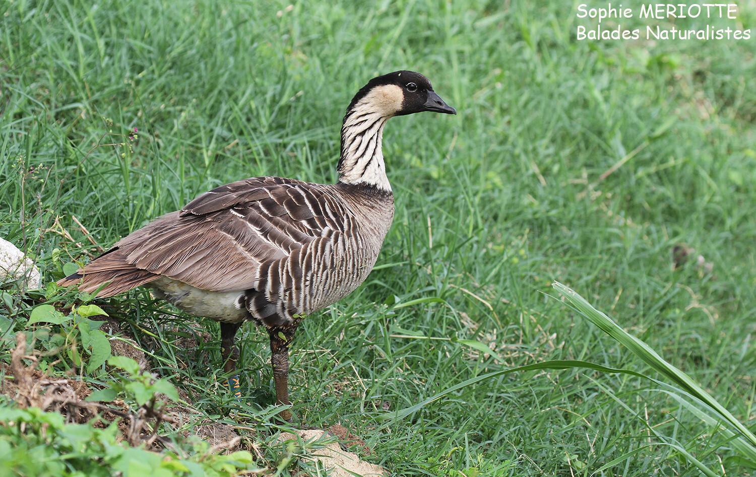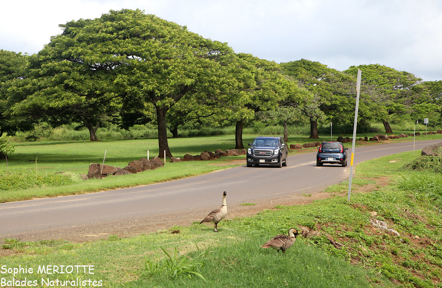 Derrière la plage, un petit point d’eau me permet de cocher deux espèces endémiques dont la bernache néné, oiseau emblématique de l’archipel. Plus discret, un couple de canard de Hawaï se tient en retrait à proximité du bord.