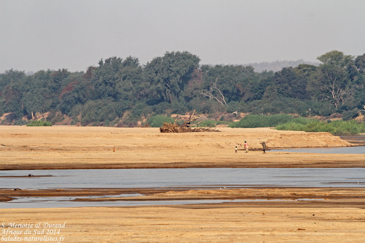 Des cris sonores et plaintifs s’échappent régulièrement du sommet des arbres, ils proviennent des calaos trompettes que nous avions découverts à Eshowe dans le Kwazu-natal. Malgré leur grande taille, ils sont difficiles à voir dans le feuillage où ils s’y camouflent parfaitement. Au bord de la piste une indication « Creek corner », nous suivons le guide. Après un kilomètre on débouche sur un petit parking avec un panorama exceptionnel. Nous sommes à la confluence entre la rivière Luvhuvu qui nous sert de fil directeur depuis la mi-journée et le fleuve Limpopo. Ici trois pays se rejoignent. Au nord le Zimbabwe, à l’est le Mozambique et au sud l’Afrique du sud. Comme très souvent, le regard sur les pays voisins génère de nouvelles envies. Ici sur les rives opposées, la végétation semble davantage luxuriante, promesses de terres sauvages où l’empreinte de l’homme n’existe pas. Pourtant, il n’est pas très loin. Une famille de pêcheurs, accompagné d’un chien, termine sa journée de pêche. Eux sont là tous les jours, en quête de poissons, et foulent les mêmes bancs de sable que les léopards et les lions faisant fi du danger. Pour nous , sécurité oblige, nous devons rester dans la voiture mais les accompagner sur les berges du Limpopo est très tentant !