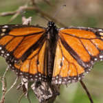 Un autre grand papillon passe à proximité de l’objectif. Celui-ci, on le connaît : le grand monarque (Danaus plexippus). Il s’agit donc de ma même espèce que celle qui effectue de longues migrations sur le continent américain. Au cours du XIXème siècle, ce grand voyageur a également colonisé d’autres régions dans le monde : la Nouvelle-Zélande en 1840 et l’Australie en 1870. Plusieurs sous-espèces sont décrites mais ce serait la sous-espèces nominale Danaus plexippus plexippus qui aurait gagné toutes ces nouvelles contrées. (Sources : Opie)