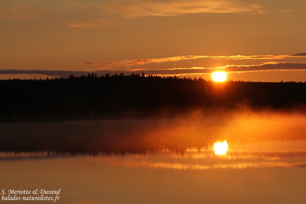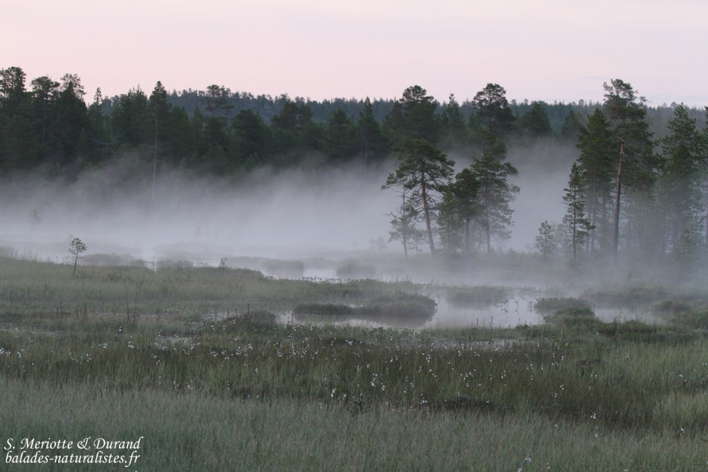 Comme pour une fois le ciel est dégagé, nous souhaitons voir le soleil de minuit. Lorsque les douze coups sonnent, nous sommes au bord d’une tourbière et écoutons le chant de 3 Chevaliers aboyeurs. Un moment de quiétude très apprécié. Le fin de la piste forestière sur laquelle nous nous sommes engagés nous révèlera encore quelques surprises avec du Hibou des marais et une bécasse en vol. Ce n’est que vers 1h30 du matin que nous fermons les yeux.