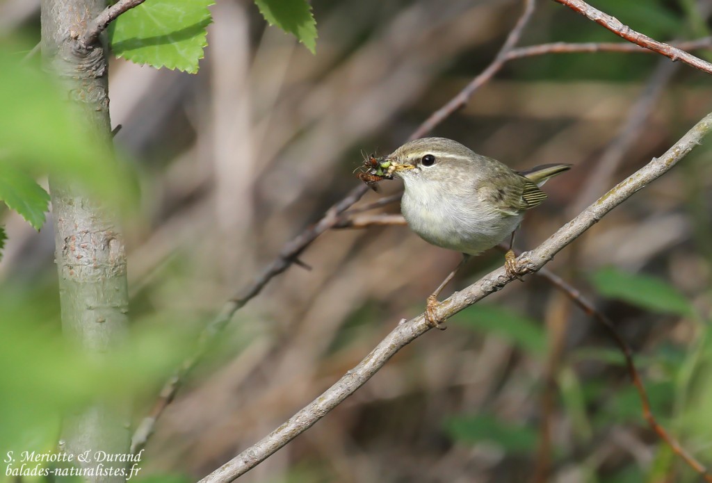 Nous retrouvons les amis ornithos qui nous ont prévenus pour le Pouillot. Au bord de la piste, à 5 m de l’endroit où nous avions garé notre voiture lors de notre premier passage, ils observent le Pouillot boréal. En fait, l’oiseau est au stade nourrissage et ne chante plus. Seul le petit cri de contact permet de le localiser. Comme tous les Pouillots, le nid est au sol. Ici c’est dans le talus à moins de 40 cm de la piste … Bref nous étions à côté de lui et avons même pris un café sans le voir ce matin ! 3 oiseaux semblent se relayer pour nourrir la progéniture dont un, au plumage abrasé, se trouve sans barres alaires. Les oiseaux sont très confiants et utilisent toujours les mêmes perchoirs à quelques mètres du nid.