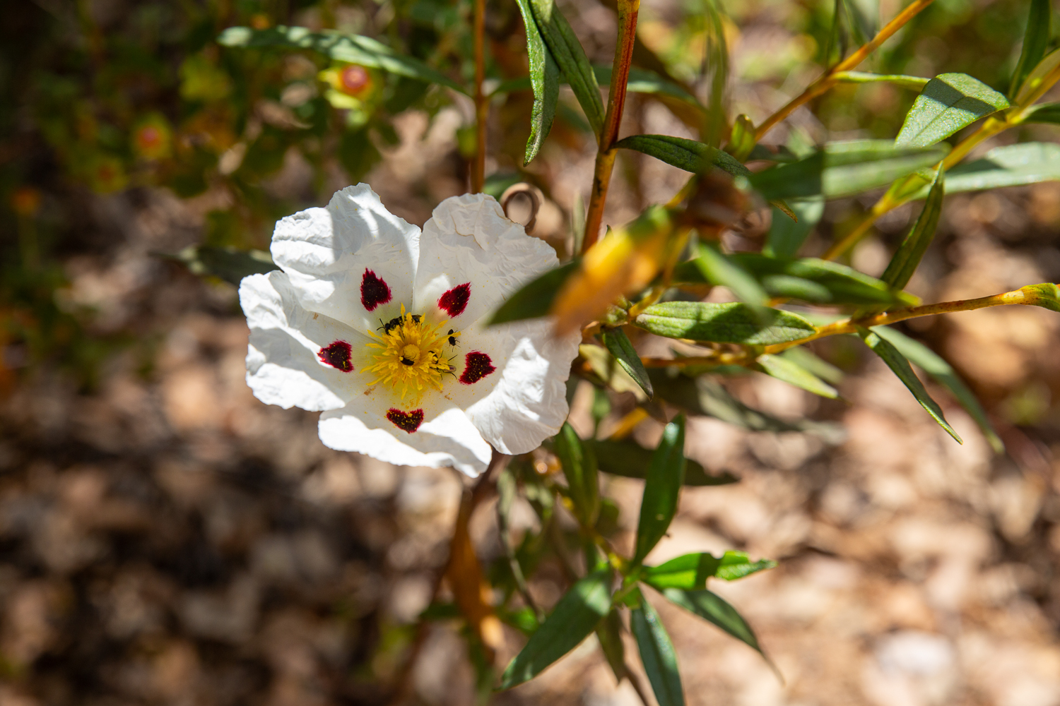 Quelques orchidées sont encore en fleur ainsi que les cistes ladanifères. Appelé également ciste porte-labdanum ou ciste à gomme, cet arbuste peut mesurer jusqu'à 2,5m de haut. Il présente de grandes fleurs blanches tâchées de pourpre. La gomme extraite de cette plante est utilisée en parfumerie.