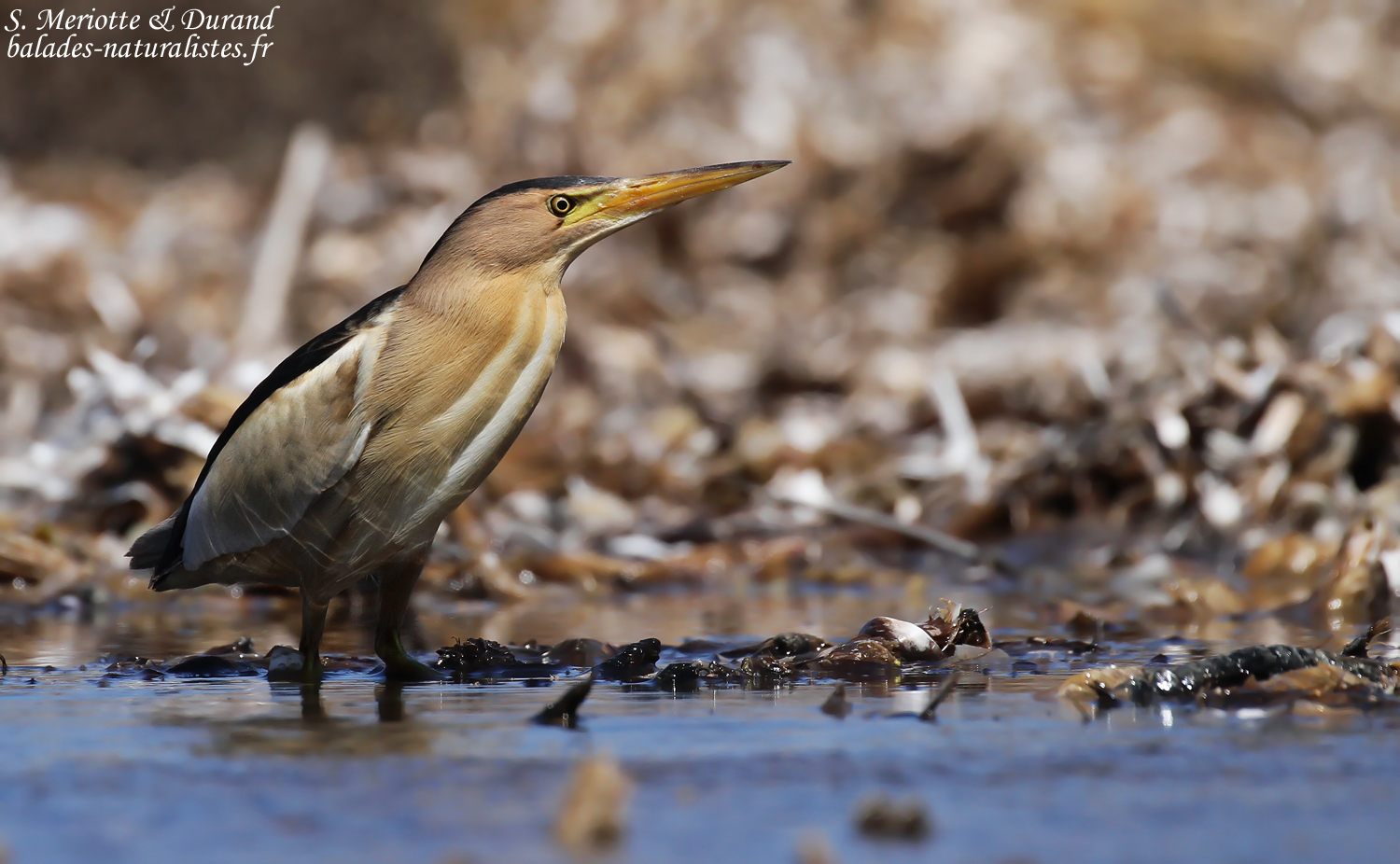 Retour à Barcaggio vers 14h et le parking où nous avons laissé la voiture. Alors que l’on s’apprête à mettre le contact, un couple de gens en train de pique-niquer nous signale la présence d’un héron en train de capturer des petits poissons. Parfaitement camouflé avec son plumage jaune et noir, un mâle de Blongios nain, hôte farouche et discret de nos roselières se tient ici parfaitement à découvert, profitant des teintes chaudes des feuilles de posidonies pour passer inaperçu. A pas lent, il avance au bord de l’eau pour se positionner, le cou rentré mais prêt à se détendre pour happer ou transpercer sa proie. Parfois, il nous tourne le dos et là encore il se confond parfaitement avec son milieu, les plumes du dos noir se confondant avec le sombre de l’eau de l’Aquae tignese. De nos vingt ans d’ornithologie, il s’agit là certainement de notre plus belle observation de Blongios.