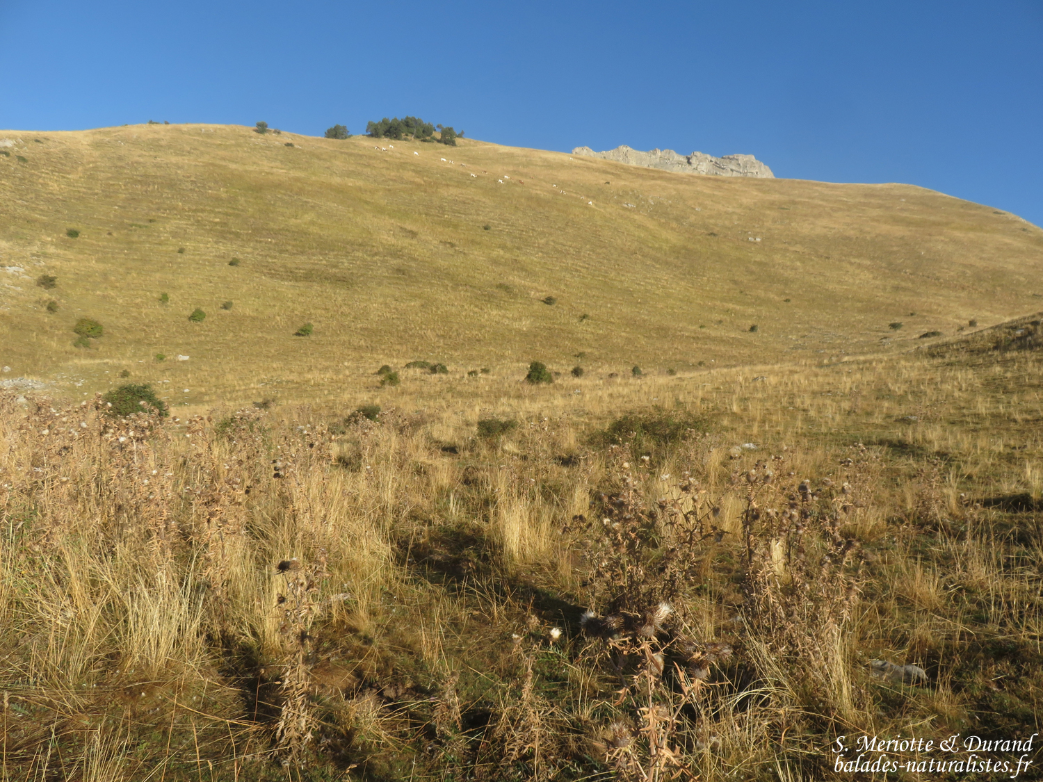 Le chemin zigzague au milieu des prairies. Nous repérons un chamois profitant de cette abondance de nourriture en limite du « mur gazonné de Gleize ». A notre passage, il s’éloigne du sentier en quelques bonds avant de jeter un dernier regard dans notre direction. Son pelage de transition, presque bicolore, nous rappelle que, malgré les températures clémentes, l’hiver vient …