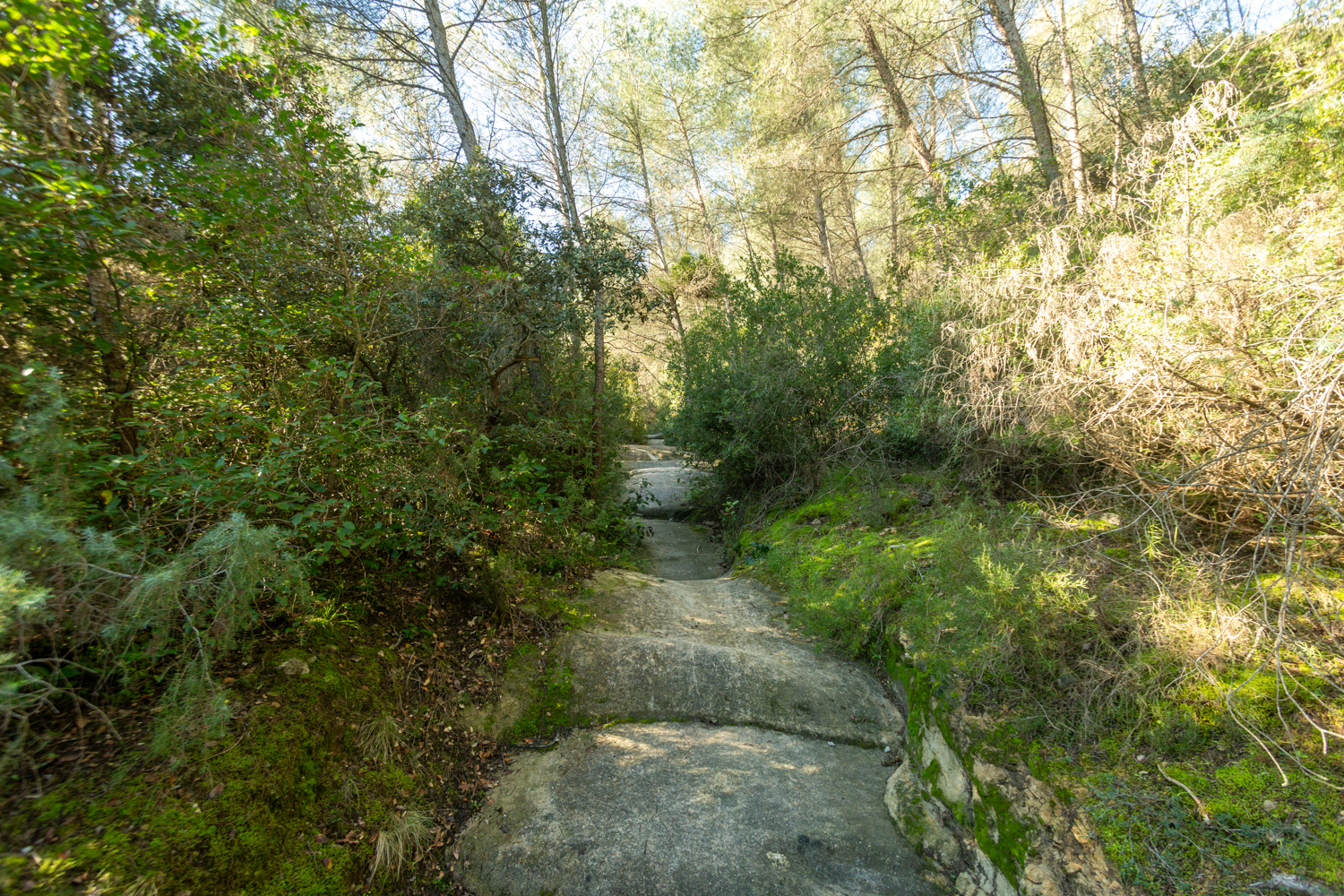 Le sentier s’élève progressivement vers les célèbres grès, formations rocheuses aux teintes chaudes qui tranchent avec le calcaire blanc dominant du massif.