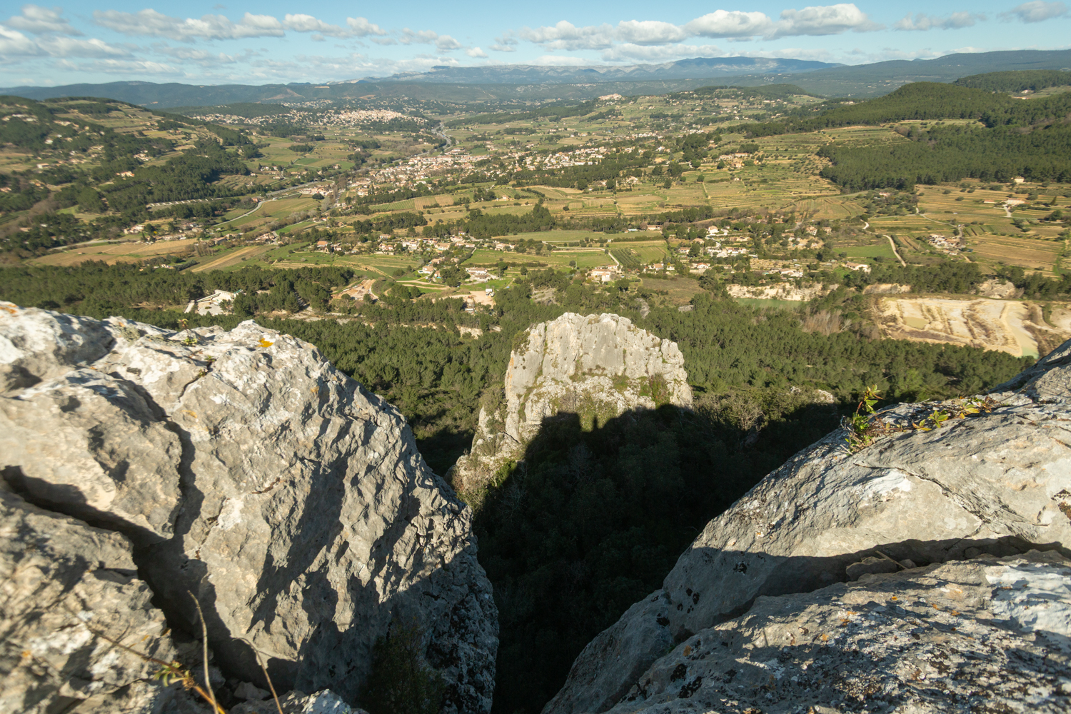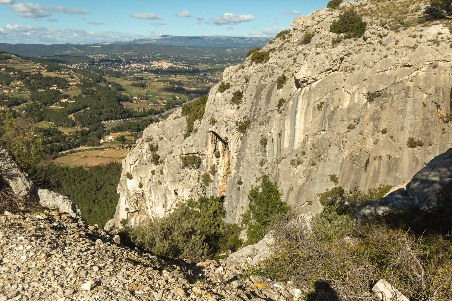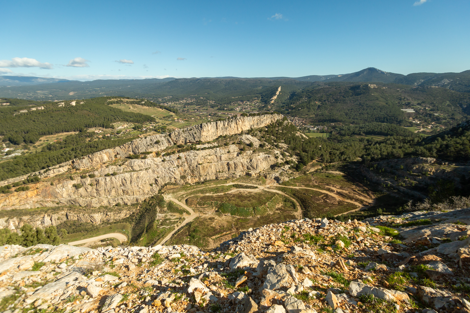 Depuis le Gros cerveau, le GR suit les crêtes surplombant la carrière. Attention, la falaise est abrupte ! Visible depuis les hauteurs, la carrière d’Évenos marque fortement le paysage par ses fronts de taille clairs entaillant la montagne. Exploitée pour son calcaire, utilisé notamment dans le bâtiment et les travaux publics, elle témoigne de l’activité extractive qui a façonné une partie de l’arrière-pays toulonnais au XXᵉ siècle. Le massif calcaire, issu de dépôts marins anciens, offre une roche compacte et résistante, recherchée pour la production de granulats.