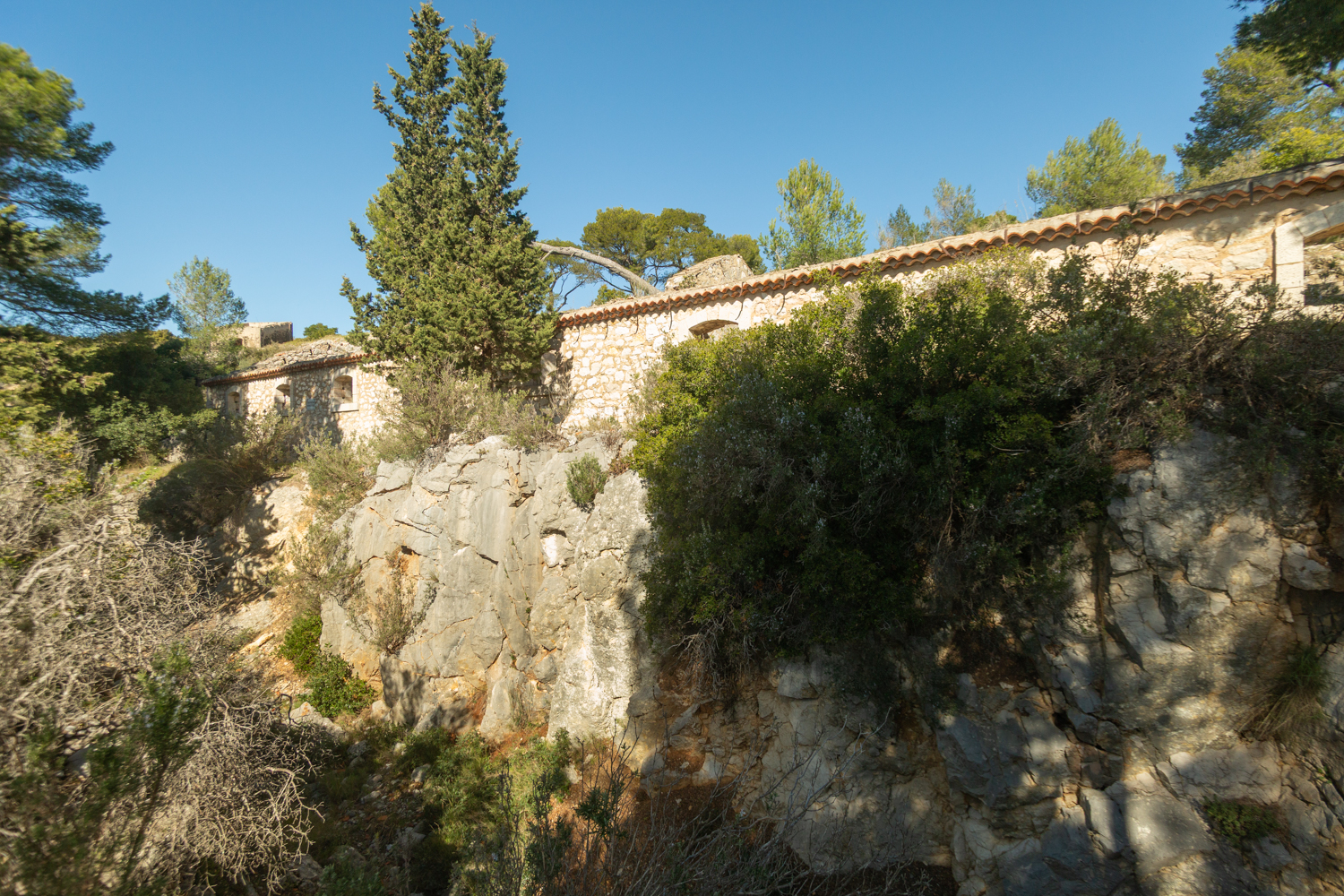 Au loin, se dresse perché sur un éperon rocheux dominant les gorges d’Évenos, le château d’Évenos. Souvent appelé château du Vieux-Évenos, il constitue l’un des sites médiévaux les plus spectaculaires de l’ouest varois. Édifié entre le XIᵉ et le XIIIᵉ siècle, il occupait une position stratégique majeure, contrôlant les voies de passage entre le littoral de Toulon et l’arrière-pays provençal.