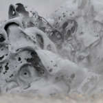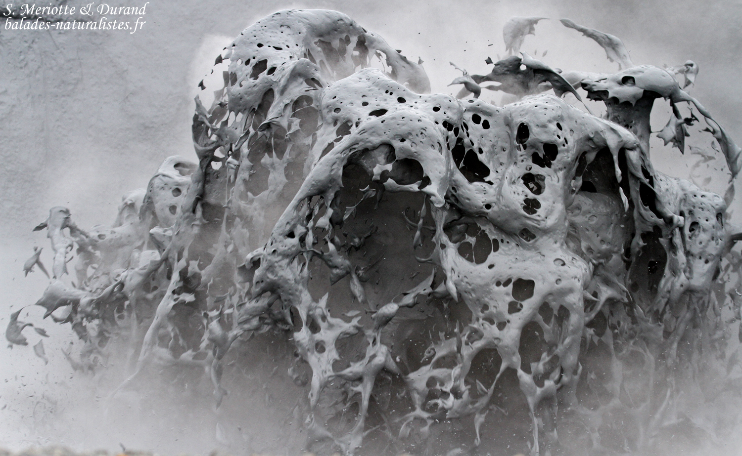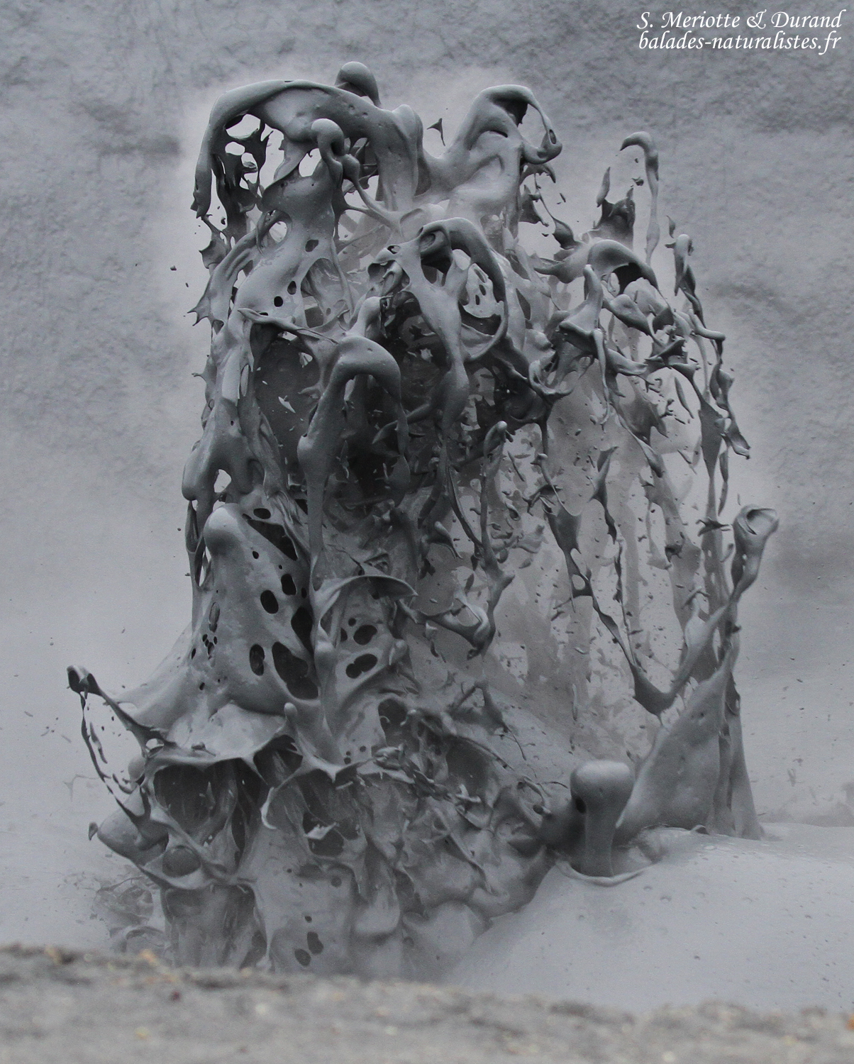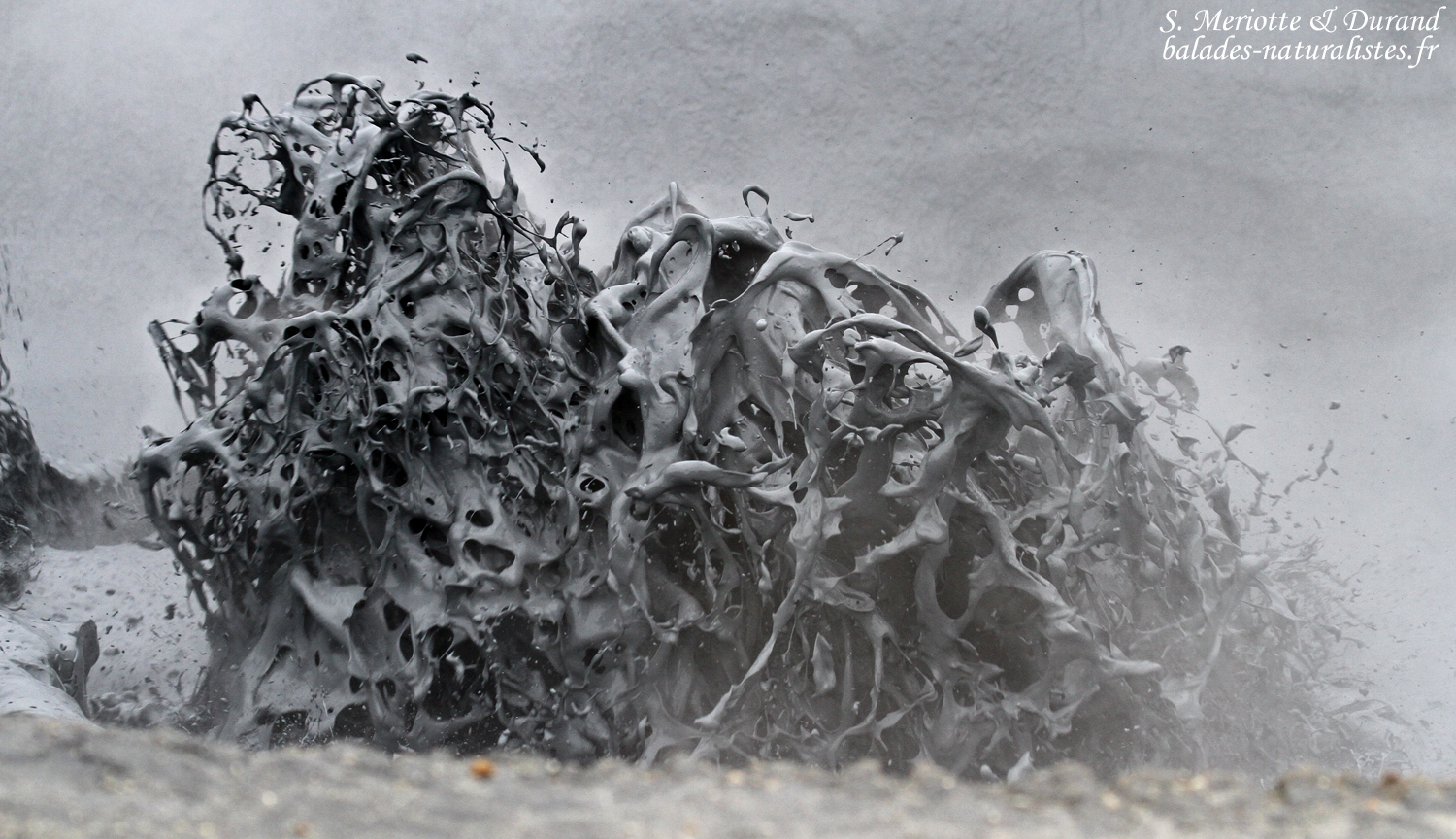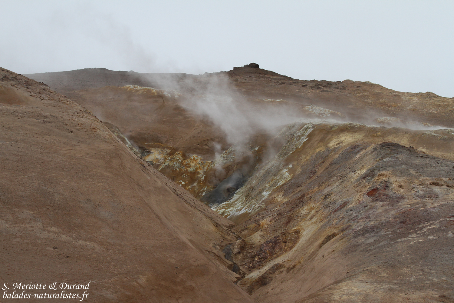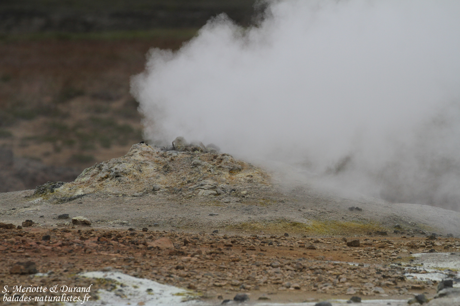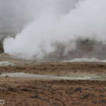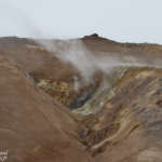 Nous quittons les abords du lac et filons en direction de volcan Krafla. Une étape intermédiaire nous donne l’occasion de visiter les solfatares, ces sortes de petits volcans d’où émanent des gaz chargées de soufre provenant des entrailles de la Terre. La production est continue et forme un nuage à l’odeur marquée (avec une légère tendance à s’incruster dans les vêtements ce qui permet de profiter de l’odeur tout au long de la journée !). On trouve aussi des fumerolles, caractérisées par des gaz s’échappant depuis une faille, une petite fissure de la roche et parfois avec des dépôts de soufre sur ses bords. Derniers témoins de cette terre vivante, les marmites de boues. Comme le disait le célèbre volcanologue Jean-marie Bardinzeff, « ça glougloute, ça crachouille ». Telles des sources d’eaux chaudes, on observe une activité continue de fines particules constituées principalement d’argiles portées à ébullition. Des poches de gaz arrivent en surface et projettent de la boue tout en dessinant des formes plus ou moins esthétiques. La texture parait onctueuse mais il ne faut pas y toucher, la température dépasse les 100°C.
