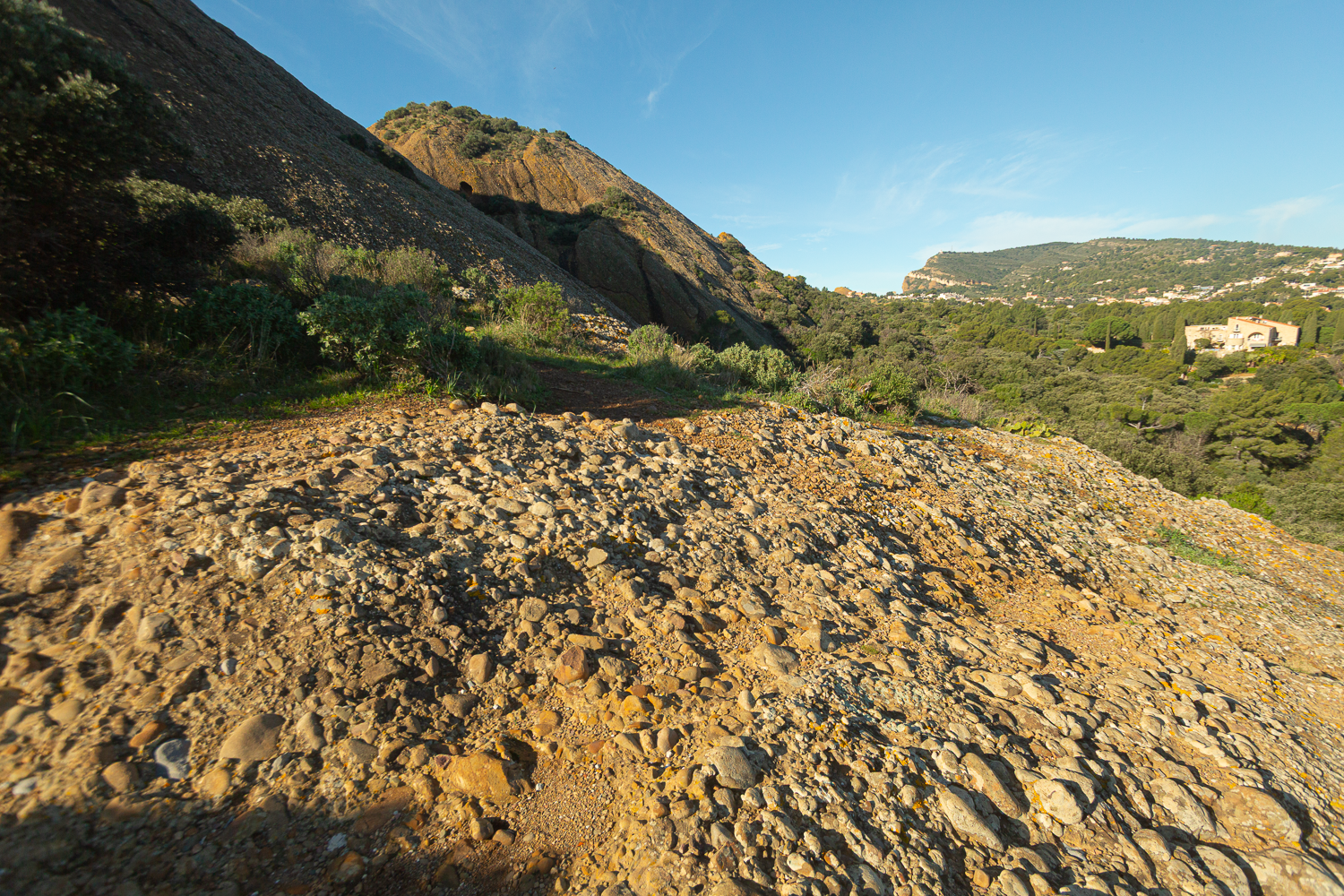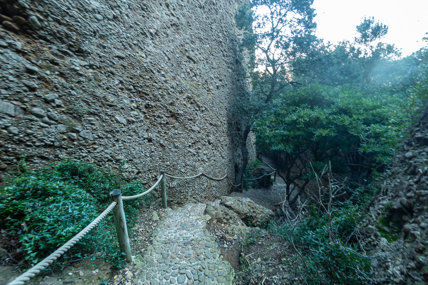 Les falaises de poudingue qui dominent le jardin du Mugel constituent l’un des paysages géologiques les plus spectaculaires du site. Cette roche singulière, composée de galets anciens soudés par un ciment naturel, témoigne de l’histoire géologique mouvementée du littoral provençal. En suivant le sentier qui serpente à flanc de falaise vers le belvédère, le visiteur chemine au pied de parois abruptes aux teintes ocre et rougeâtres, caractéristiques du poudingue du Bec de l’Aigle.
