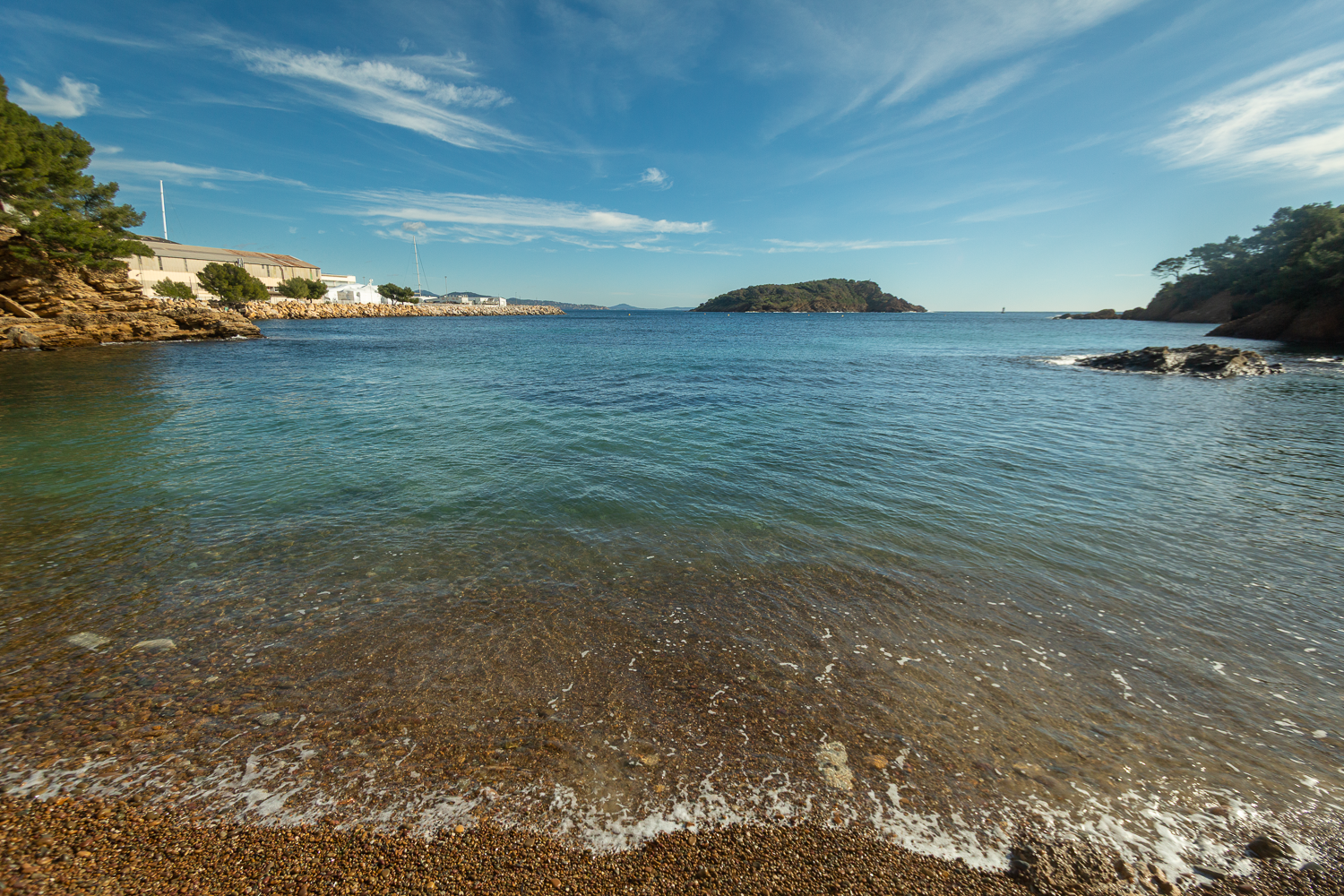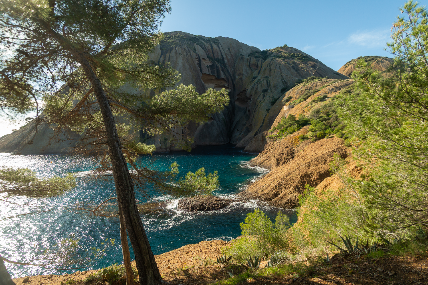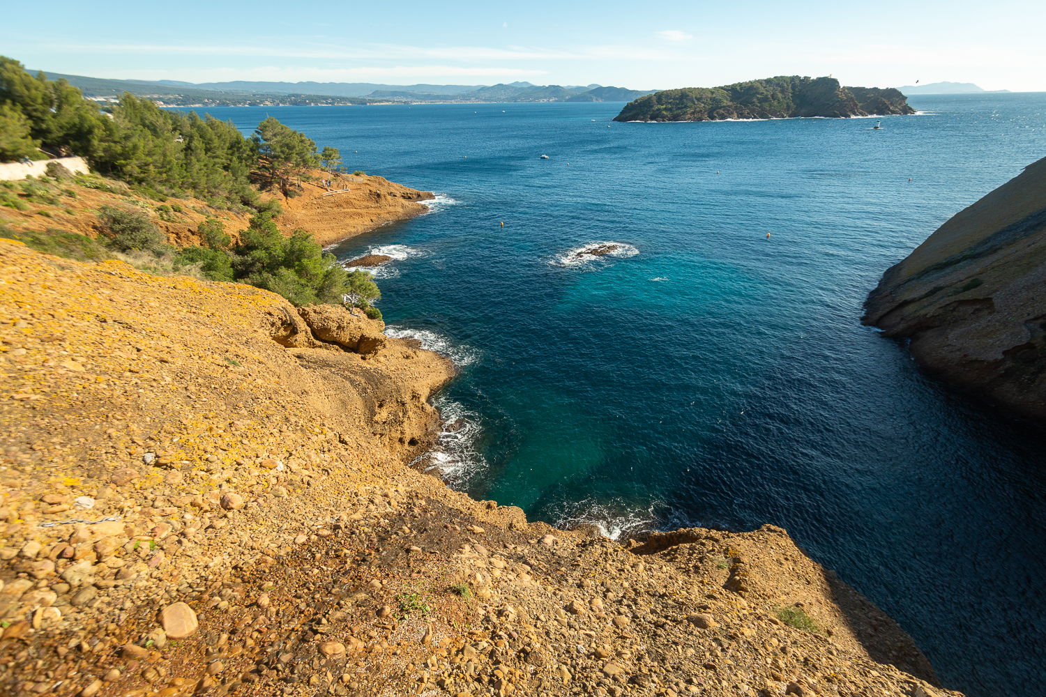 Les roches orangées du poudingue s’évanouissent ici dans le bleu turquoise de la calanque. Vers le nord, le massif de la Sainte-Baume s’étire en direction de l’Est. On devine la silhouette des monts toulonnais et plus au sud, le cap Sicié. Face à nous, l’ile verte se dresse fièrement hors de l’eau, sauvage et préservée,