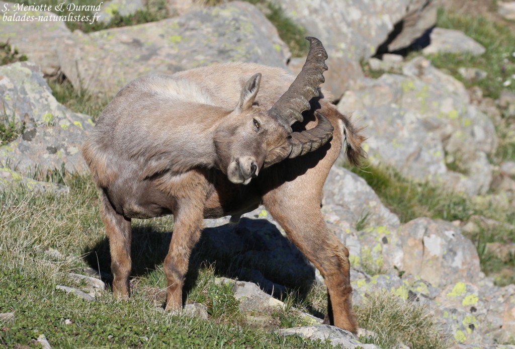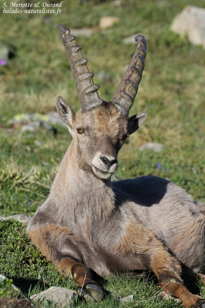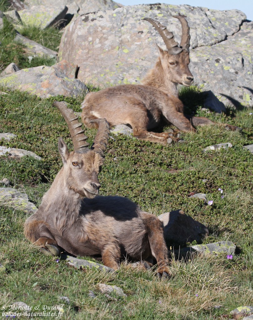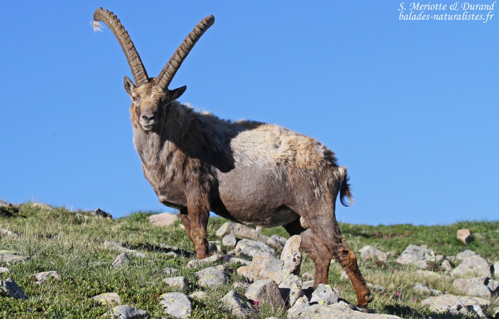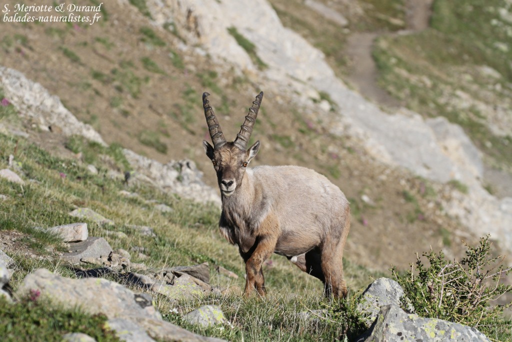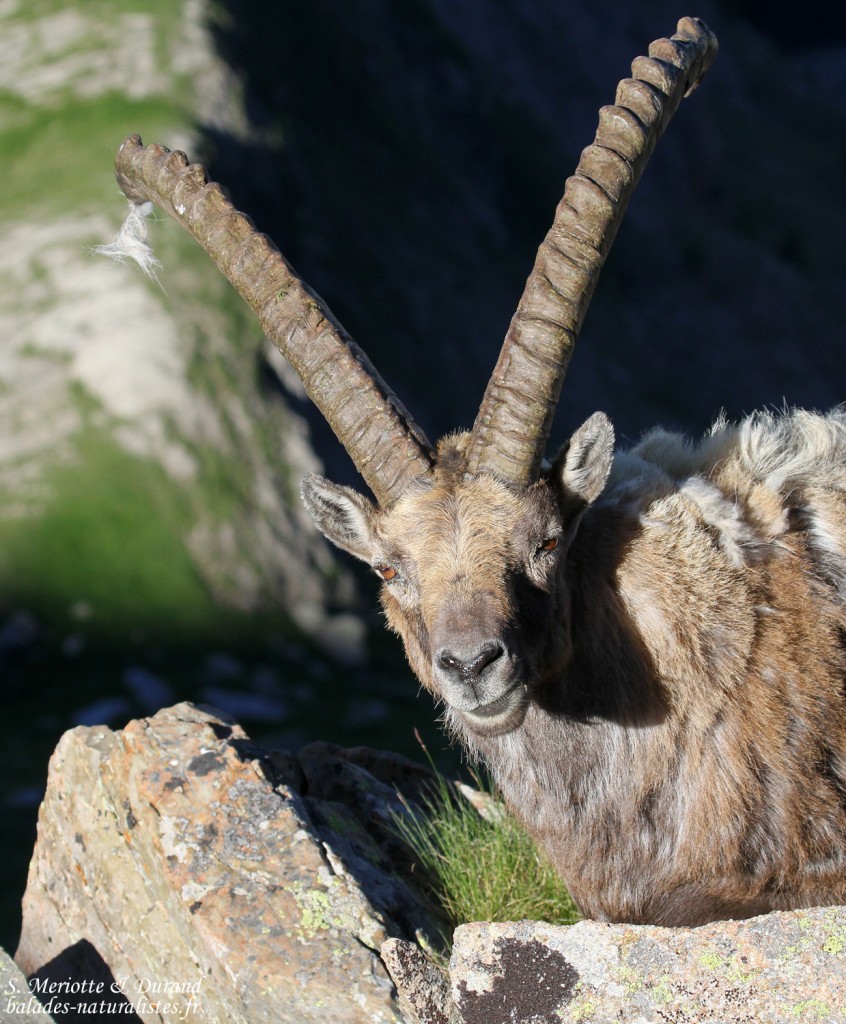 Disparaissant derrière une arête rocheuse, il réapparait dans un éboulis et rejoint un autre groupe composé de beaux mâles adultes et de mâles immatures. Pas d’éterles ou d’étagnes en vue. Habituellement, les femelles accompagnées ou non de leurs cabris se trouvent à des altitudes inférieures, seuls les mâles se plaisent sur les sommets alpins. Nous avons de la chance, ce groupe se trouve sur notre chemin de randonnée mais si nous restons dessus, nous allons avoir les animaux à contre-jour. Il faut couper à travers un petit pierrier et gravir une pente sèche afin de se trouver en bonne position pour les photos.