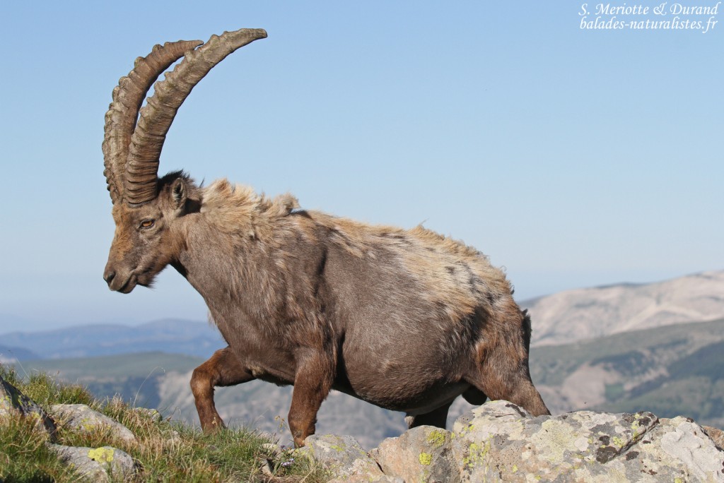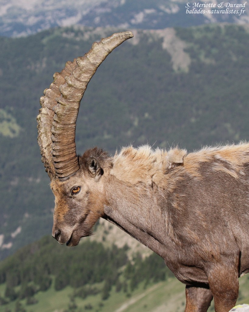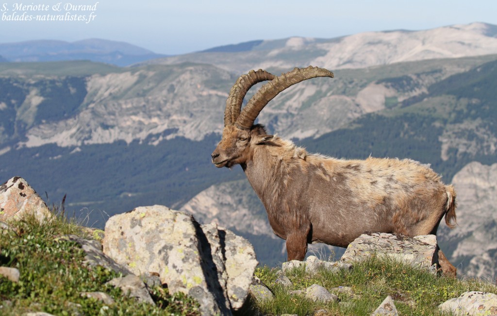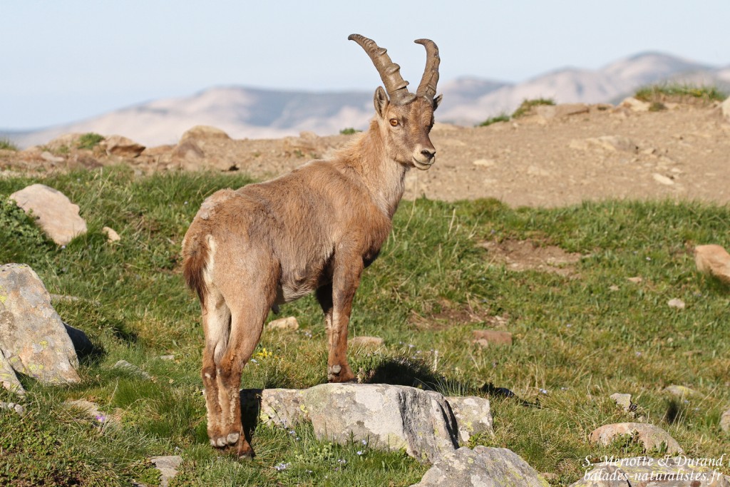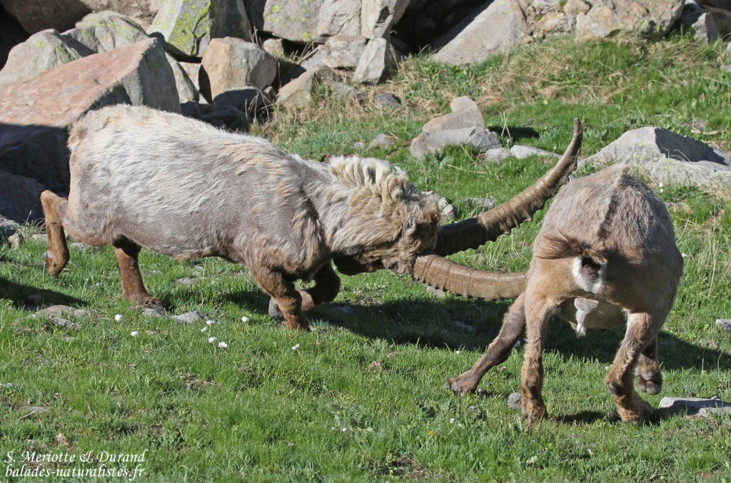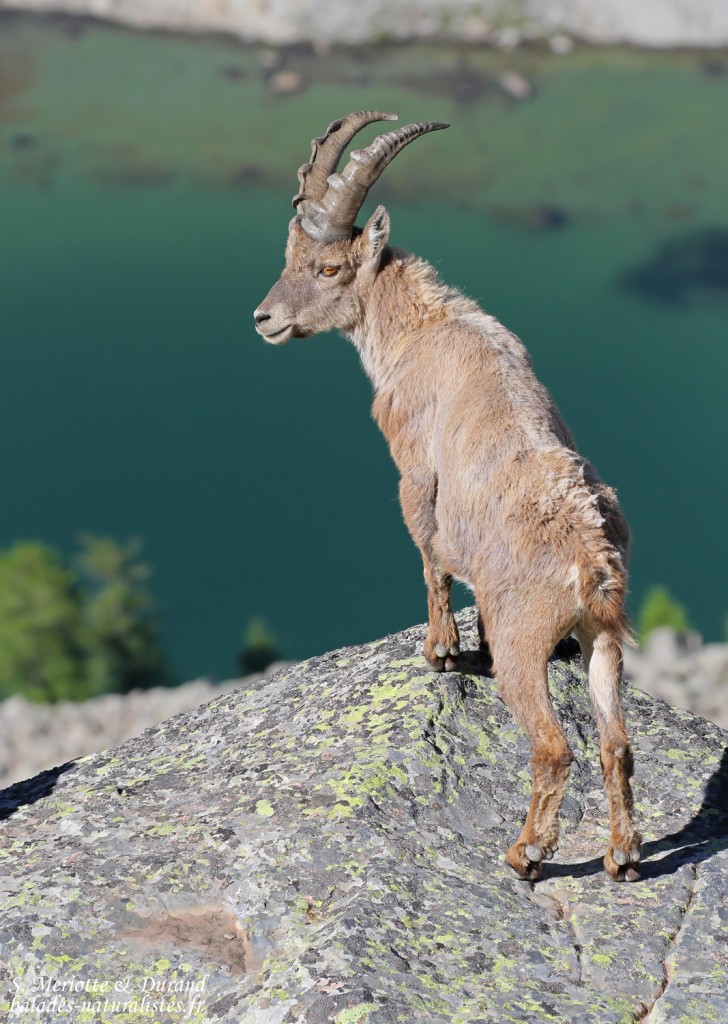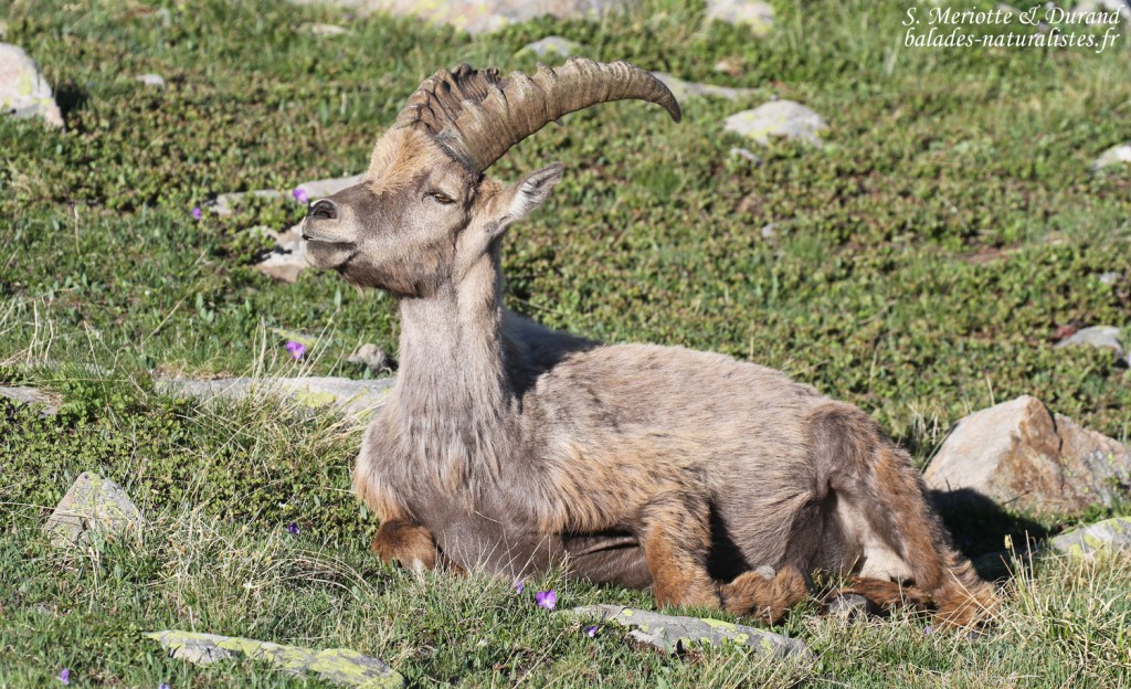 Disparaissant derrière une arête rocheuse, il réapparait dans un éboulis et rejoint un autre groupe composé de beaux mâles adultes et de mâles immatures. Pas d’éterles ou d’étagnes en vue. Habituellement, les femelles accompagnées ou non de leurs cabris se trouvent à des altitudes inférieures, seuls les mâles se plaisent sur les sommets alpins. Nous avons de la chance, ce groupe se trouve sur notre chemin de randonnée mais si nous restons dessus, nous allons avoir les animaux à contre-jour. Il faut couper à travers un petit pierrier et gravir une pente sèche afin de se trouver en bonne position pour les photos.