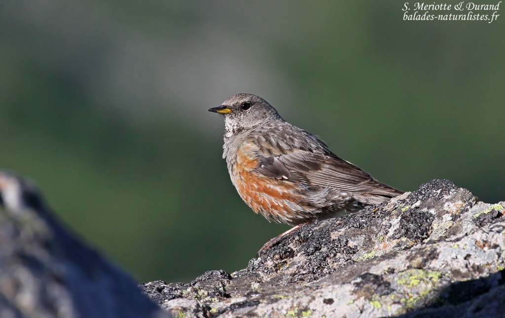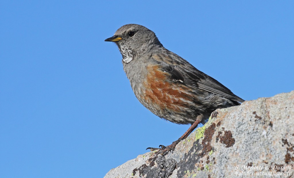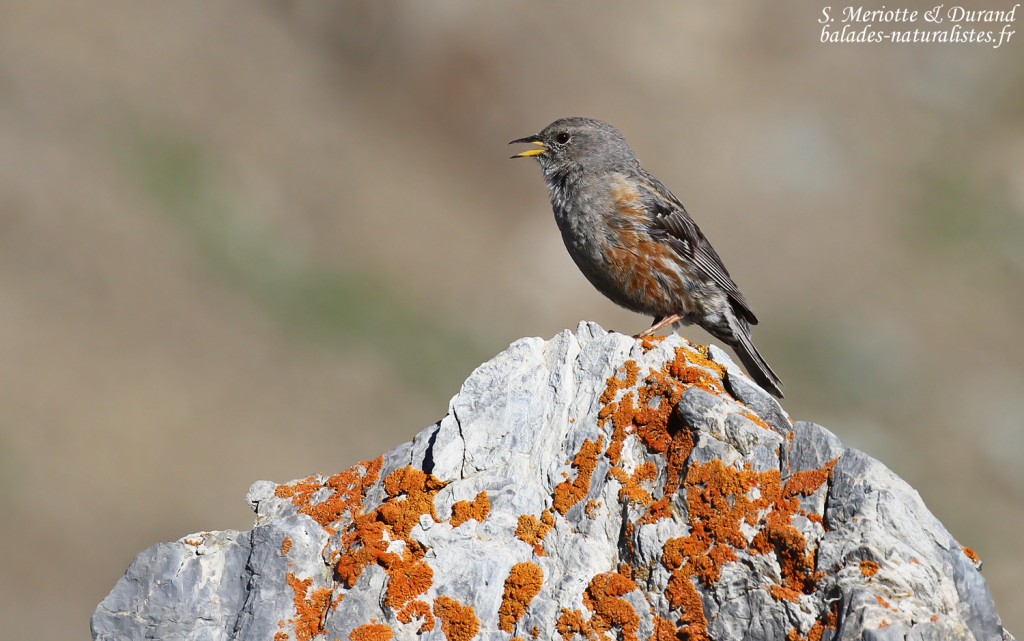 Plus intéressant pour nous est l’Accenteur alpin. Deux à trois oiseaux se partagent les environs. Son plumage gris lui permet de se confondre avec les rochers et les teintes rousses sur les flancs reproduisent à merveille les teintes des lichens qui poussent sur ces mêmes rochers. Une fois au sol en train de se nourrir, ils sont aussi difficiles à voir, sans cesse en mouvement, ils passent derrière une plante, un rocher pour ressortir là où on ne les attend pas ! Un oiseau vient chanter près de nous quelques secondes avant de se raviser et de s’éloigner.