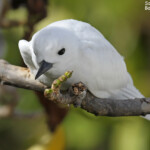 La Gygis blanche (Gygis alba) qui répond au nom local “zwazo la vierz”. Appelée également sterne blanche, elle est inféodée aux zones tropicales et niche sur les île de l’océan Indien, du Pacifique et de l’Atlantique. Sa population globale est estimée à 100 000 couples. Sur Rodrigues, la population nicheuse est faible mais stable. Elle niche dans le creux des arbres où elle dépose un seul oeuf. Le poussin possède des griffes tranchantes qui lui permettent de s’accrocher à sa branche lorsque le vent est fort.