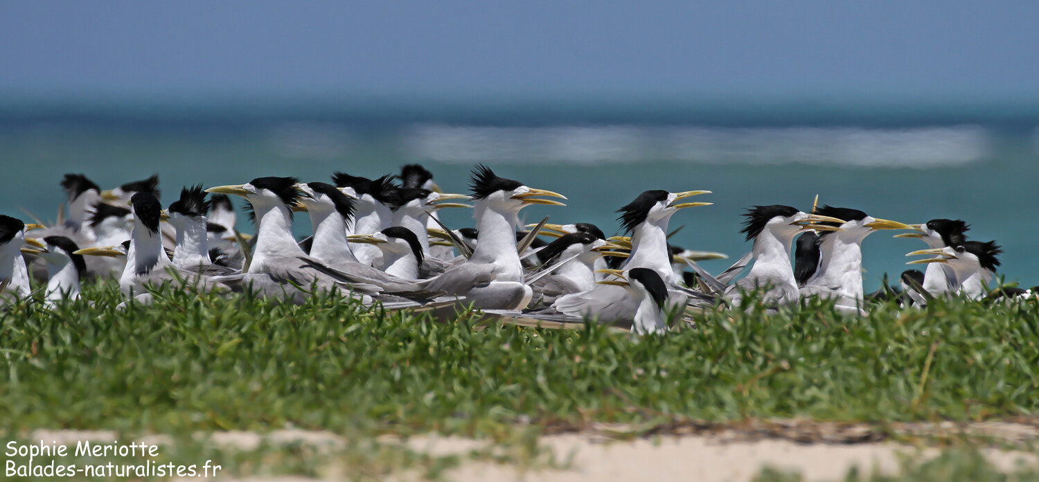 Parmi ces grandes sternes ce sont glissées d’autres espèces : la sterne diamant (au centre de la photo avec le front et le dessus de la tête blancs) et la sterne de Dougall (celles avec le bec rouge).