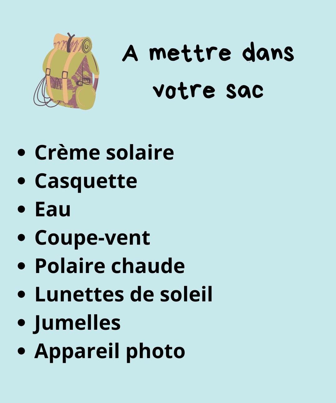 • Ne pas choisir une excursion trop longue (2 ou 3h suffisent)