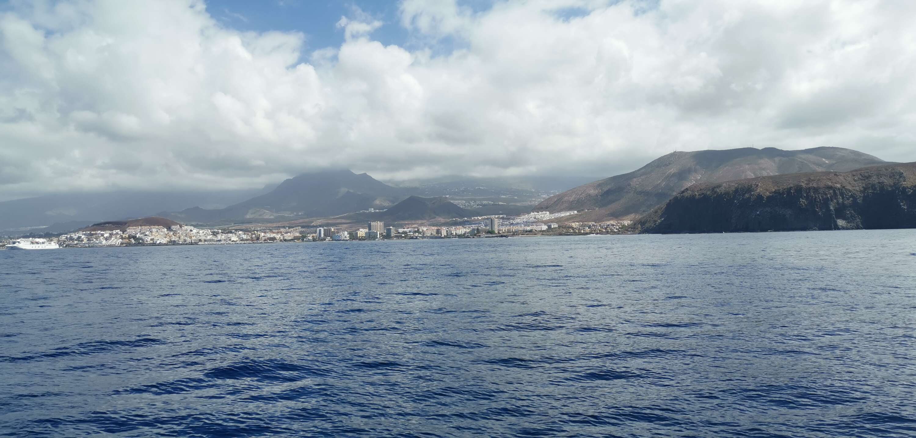 19 avril 2023. Nous embarquons le matin depuis le port de Los Christianos au sud ouest de l’île. Un grand parking payant se situe à l’entrée, non loin du point de RDV. Nous sommes en avance et en profitons pour prendre un copieux petit déj. Les conditions météo sont idéales et nous finissons par embarquer pour une excursion de 2 heures. Cela peut sembler court pour une sortie de Whalewatching, mais comme nous sommes sur une île au milieu de l’océan, nous sommes très rapidement sur les zones propices à l’observation des cétacés. Il n’y a pas à naviguer longtemps. De plus, les globicéphales sont sédentaires ici et leur population relativement importante.