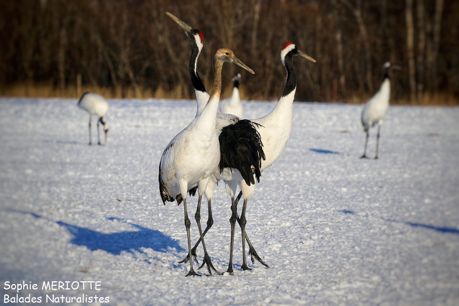 Elle niche et s’alimente dans des marais pourvus en eau profonde. Sa parade nuptiale a largement contribué à la réputation de cet oiseau. Avec des sauts et de larges mouvements d’ailes, on peut parler d’une véritable danse. La grue du Japon est sédentaire dans cette partie Est d’Hokkaido, en partie grâce aux points de nourrissage qui permettent de fixer les populations hivernantes. Elle niche également en Chine et en Russie en particulier dans les plaines bordant Lac Khanka situé à la frontière.