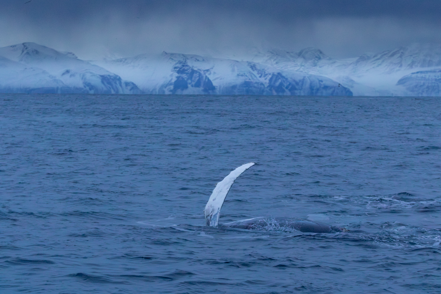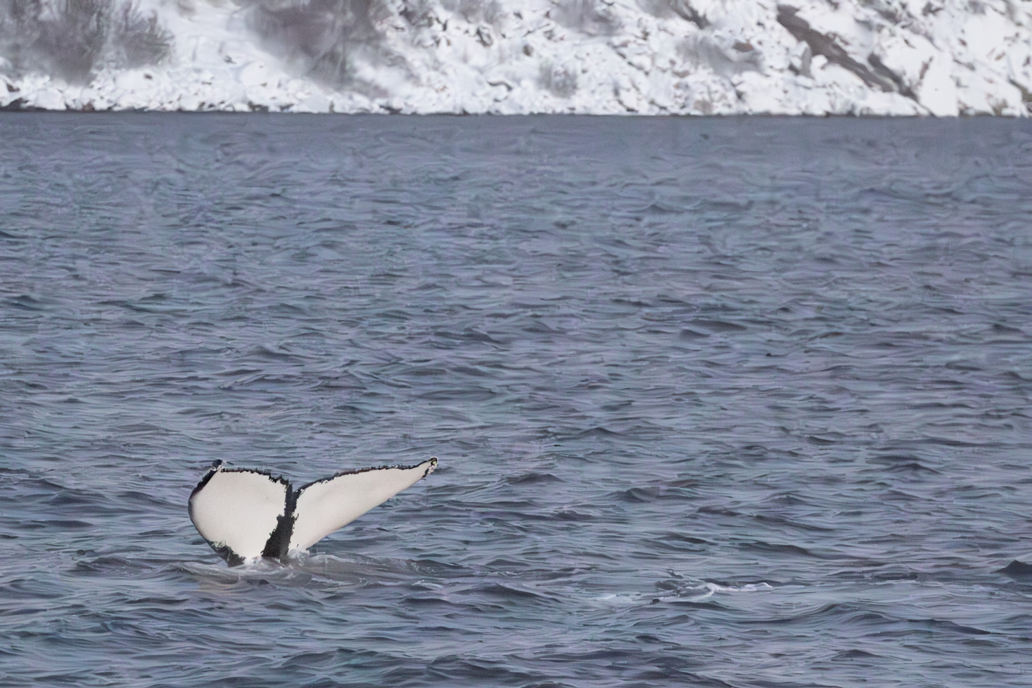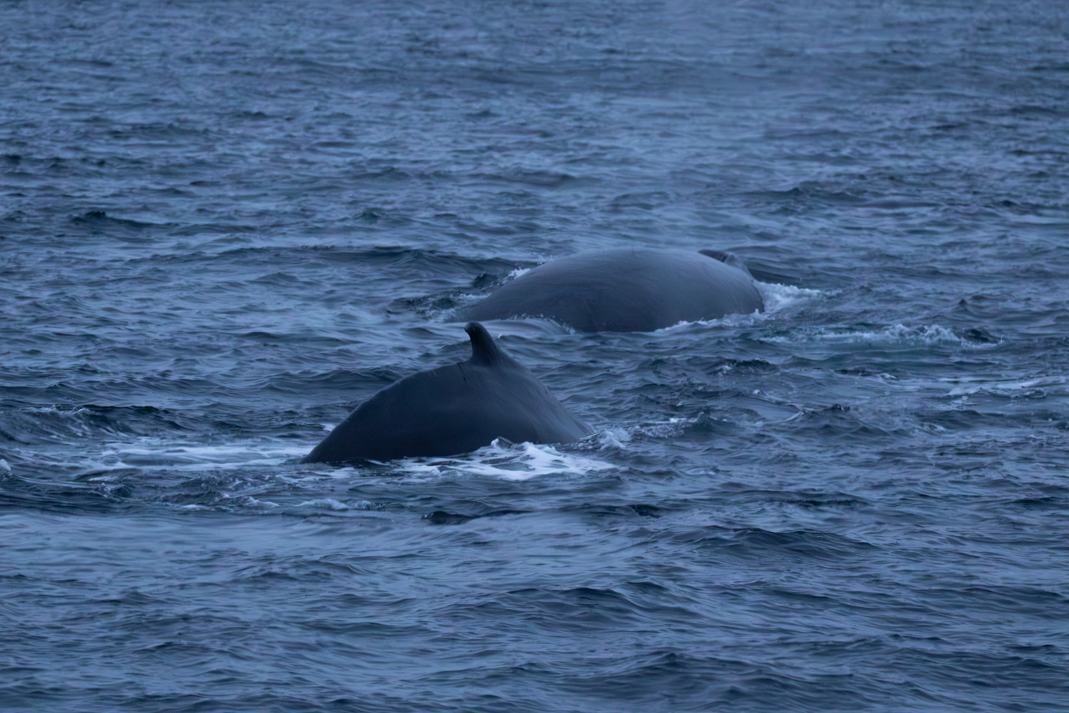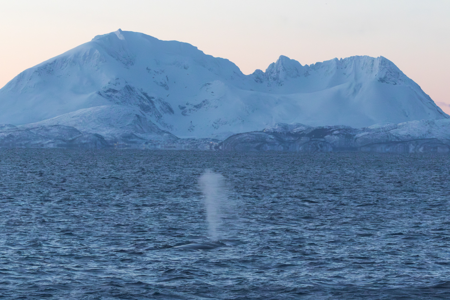 Le temps passe vite quand on est en si bonne compagnie. Mais la nuit polaire nous rattrape bien vite et il est déjà l’heure de reprendre la route de tromso. Quand un nouveau souffle surgit. Une jolie surprise pour la fin : un rorqual commun nous fait l’honneur d’une brève apparition avant de disparaître dans l’obscurité.