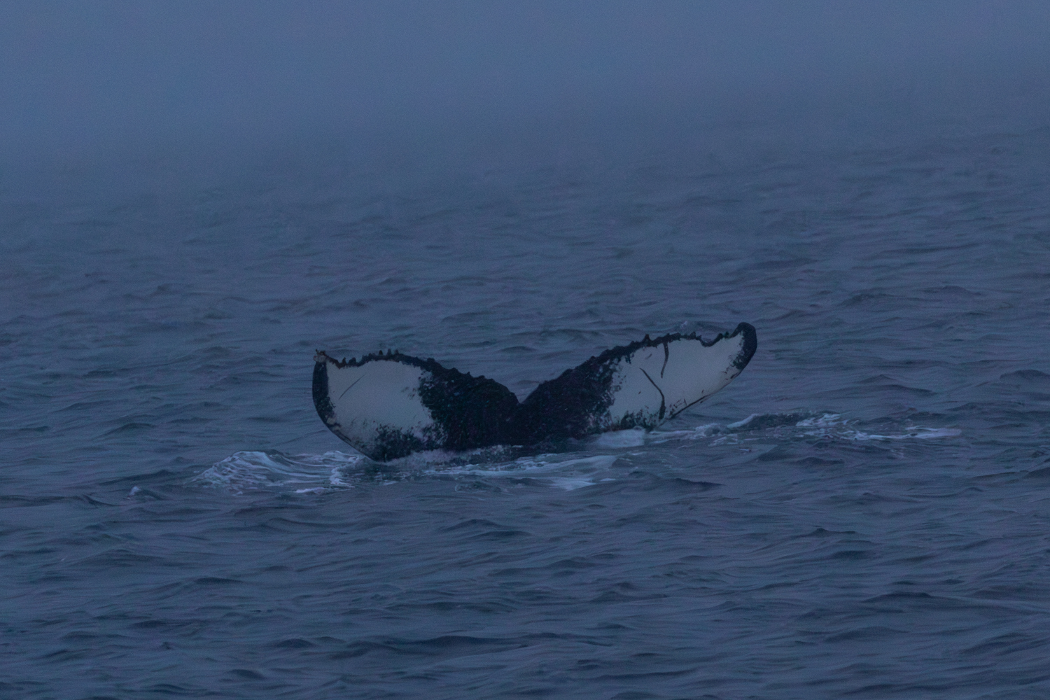 Une fois encore, ce sont les baleines qui se montrent les plus coopératives. Nous observons 3 individus dans d’assez bonnes conditions, mais comme je vous l’explique plus haut, le pont du navire d’Helgoy est très étroit, et c’est un peu compliqué de bien se placer pour voir les animaux. Je profite cependant de cette faible lumière pour faire quelques images différentes de celles prises les jours précédents.