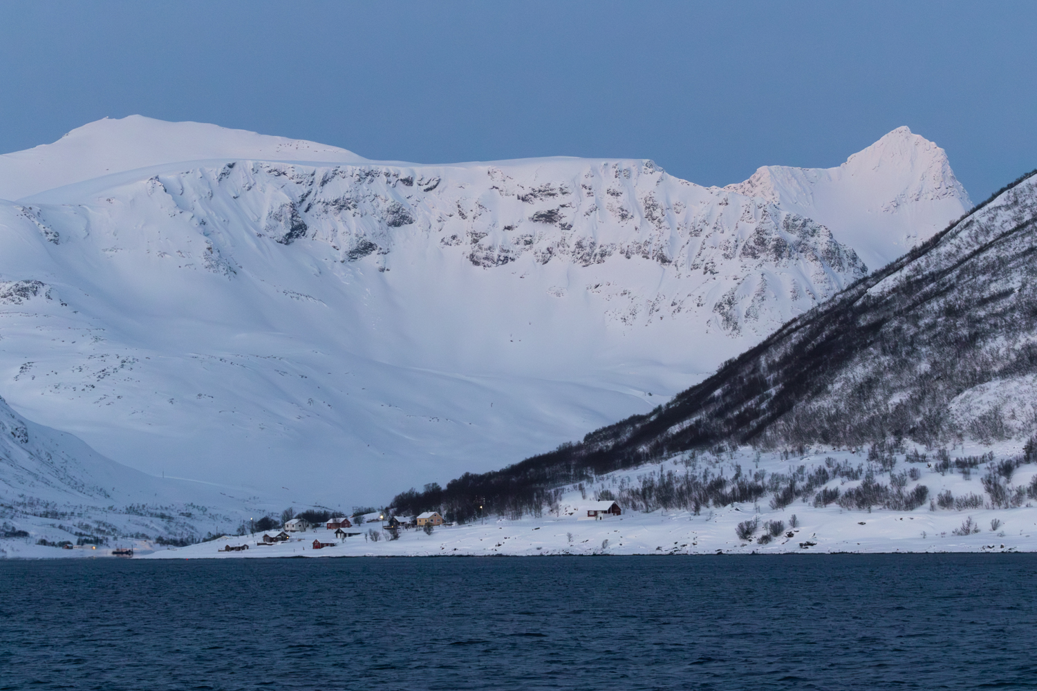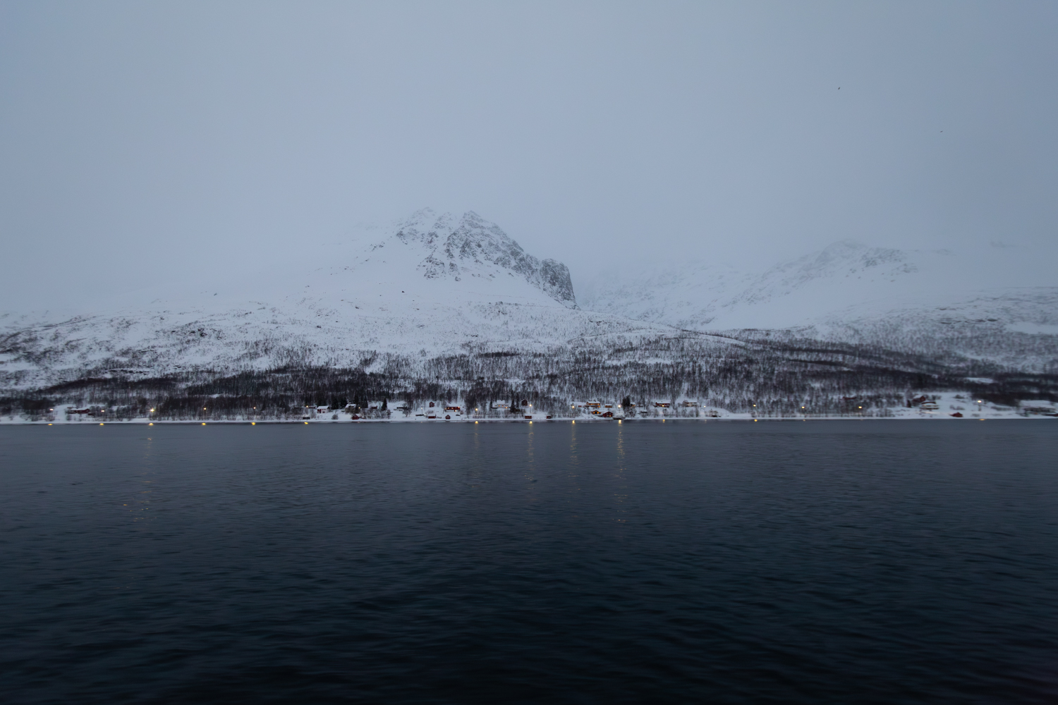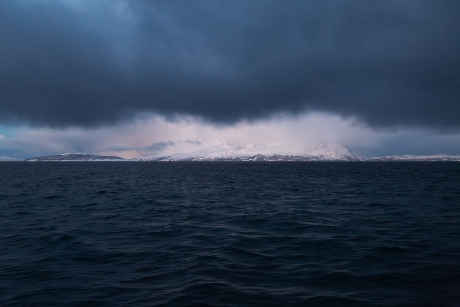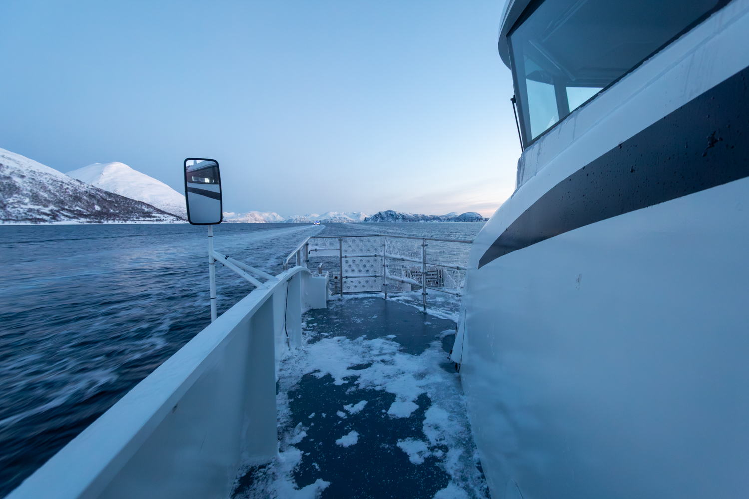 C’est sous une neige abondante que j’embarque au petit matin au port de Tromso. Le navire quitte le port de bonne heure, dans la nuit polaire glaciale. La tempête qui a fait rage les jours précédents nous a laissé une mer très agitée et nombreux sont les passagers malades. Durant les 2h30 de trajet qui nous éloignent de la zone de présence des cétacés, il est impossible de mettre le nez dehors si ce n’est au prix d’une douche arctique. Enfin, nous ralentissons et nous pouvons admirer les montagnes enneigées qui encadrent le fjord.