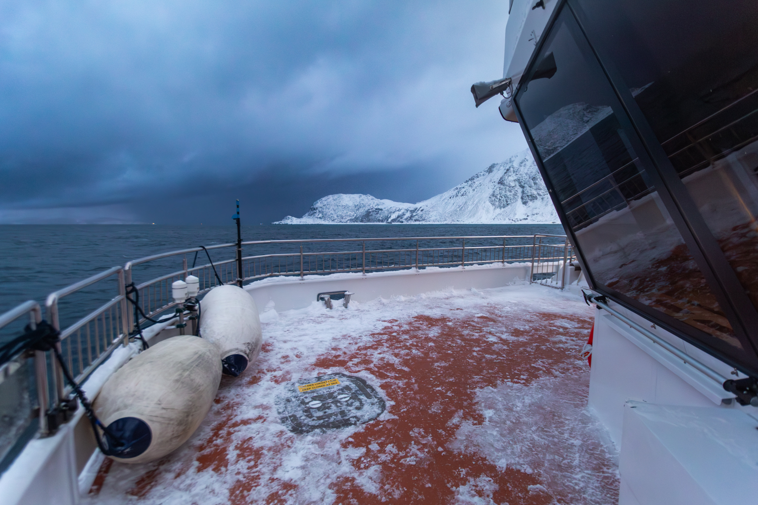 Le bateau de Helgoy en revanche, certes rapide et très confortable, présente en revanche un pont étroit où il est difficile de passer d’un côté à l’autre et d’accéder à une place pour observer et faire des images.