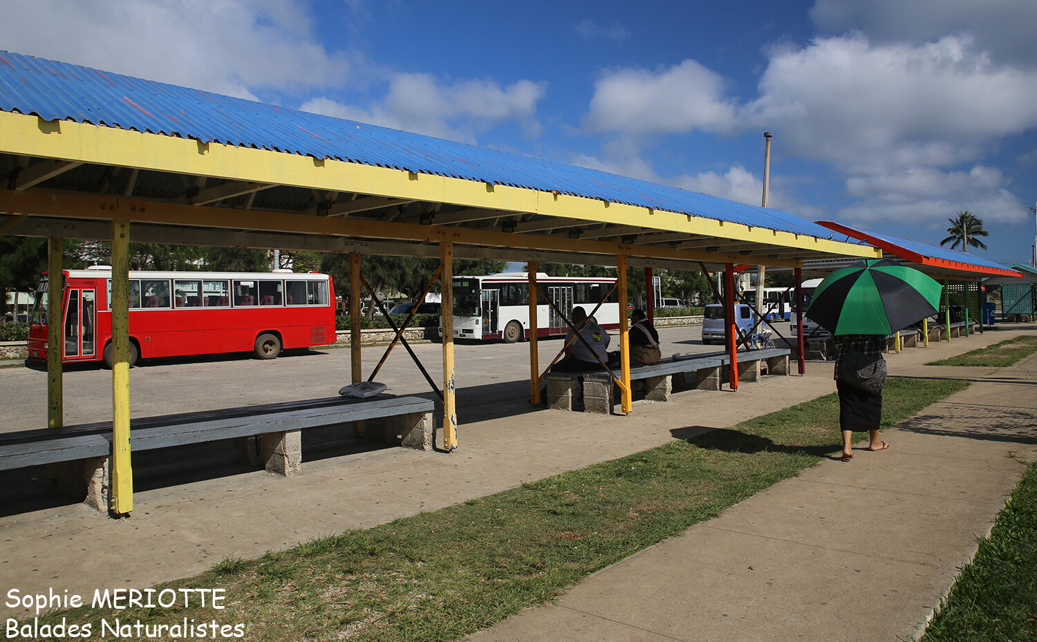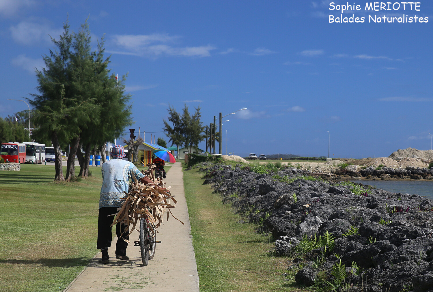 Il faut une petite heure de marche pour rejoindre le wharf depuis Captain Cook. Je n’ai plus de voiture et ce sera l’occasion de balader en ville. Je pars donc de bonne heure avec mon sac à dos et mon matos de snorkeling. La ville est animée, les jeunes vêtus de leur costume traditionnel prennent la direction de l’école. Je fais une halte au petit café dans le centre pour prendre un véritable petit déj, brioches caramélisées et bananes, pas très diététique mais ça fait du bien ! Je prends mon temps et poursuis ma route le long de la digue. Les bus colorés vont et viennent depuis la gare routière qui permet de relier la capitale aux autres villages de l’île.