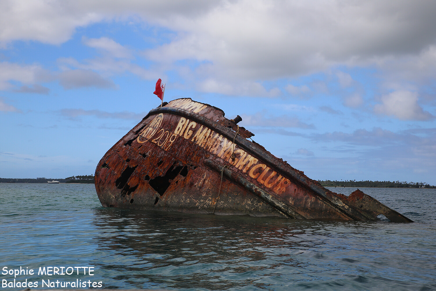 Pas besoin de réserver à l’avance pour aller à Pangaimotu. Il suffit d’être là au départ du bateau. Nous ne sommes pas nombreux, un couple d’australien, deux australiennes, un couple de photographe néozélandais avec qui je sympathiserai et un couple de chinois et leurs deux enfants. Arrivés sur l’île, nous nous acquittons des 60$ qui comprennent la traversée et le repas que l’on commande immédiatement au petit snack installé sur la plage devant laquelle se dresse la poupe d’un navire échoué.