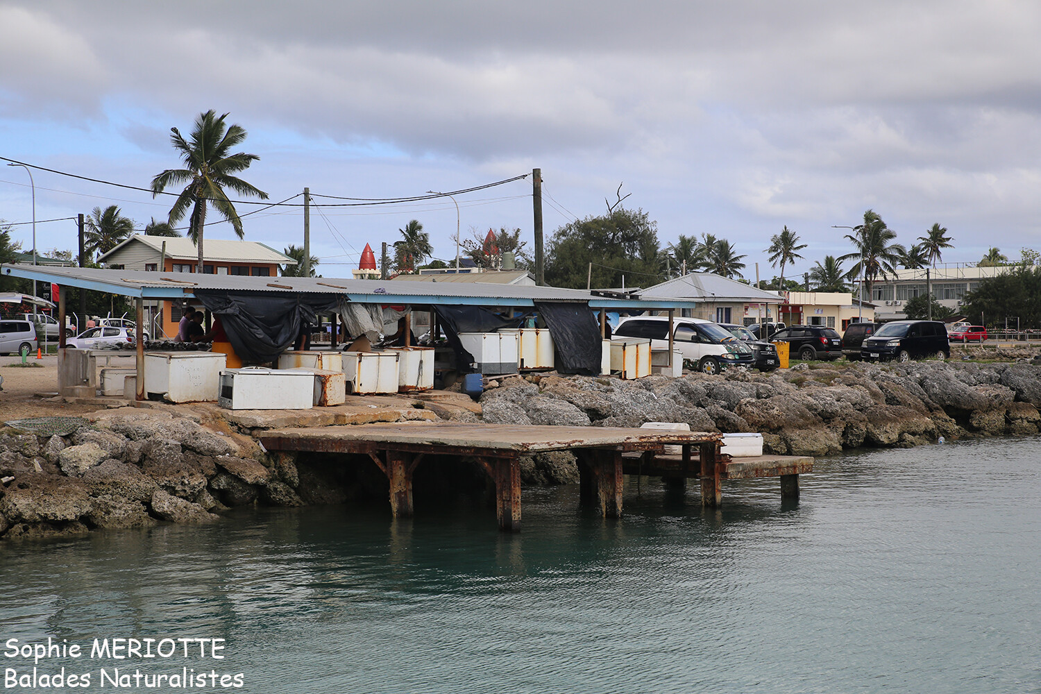 Il faut une petite heure de marche pour rejoindre le wharf depuis Captain Cook. Je n’ai plus de voiture et ce sera l’occasion de balader en ville. Je pars donc de bonne heure avec mon sac à dos et mon matos de snorkeling. La ville est animée, les jeunes vêtus de leur costume traditionnel prennent la direction de l’école. Je fais une halte au petit café dans le centre pour prendre un véritable petit déj, brioches caramélisées et bananes, pas très diététique mais ça fait du bien ! Je prends mon temps et poursuis ma route le long de la digue. Les bus colorés vont et viennent depuis la gare routière qui permet de relier la capitale aux autres villages de l’île.