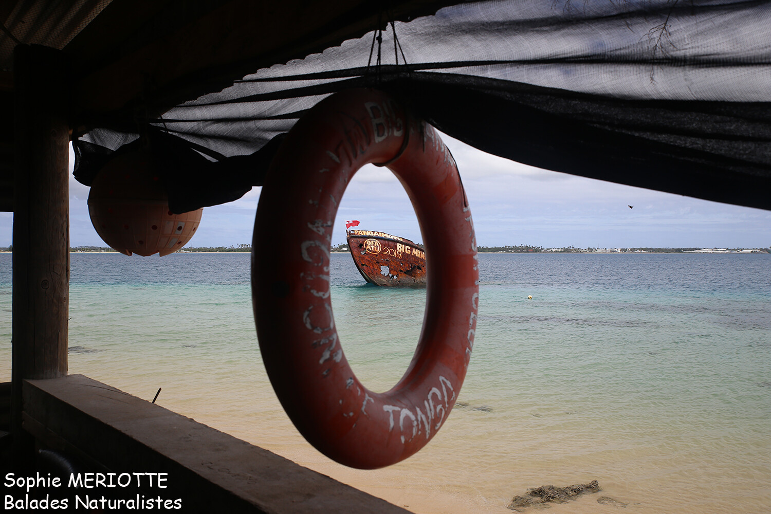 Pas besoin de réserver à l’avance pour aller à Pangaimotu. Il suffit d’être là au départ du bateau. Nous ne sommes pas nombreux, un couple d’australien, deux australiennes, un couple de photographe néozélandais avec qui je sympathiserai et un couple de chinois et leurs deux enfants. Arrivés sur l’île, nous nous acquittons des 60$ qui comprennent la traversée et le repas que l’on commande immédiatement au petit snack installé sur la plage devant laquelle se dresse la poupe d’un navire échoué.