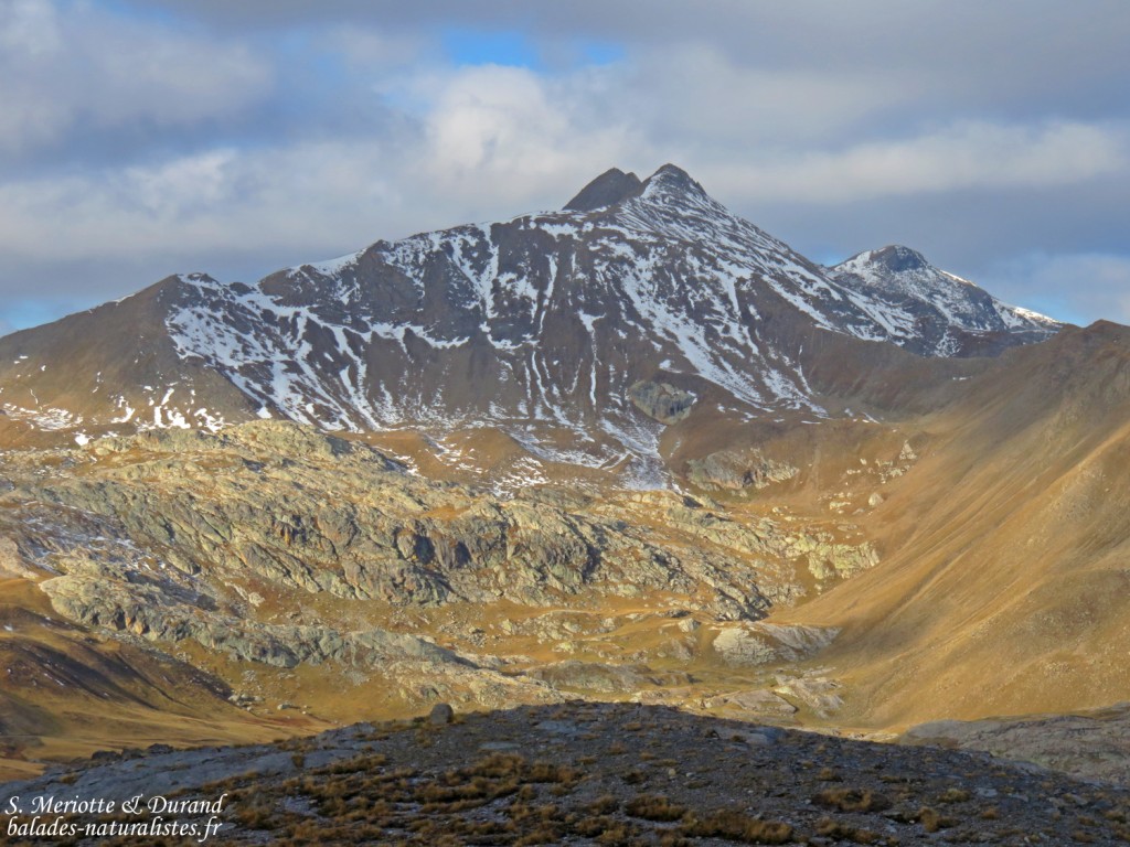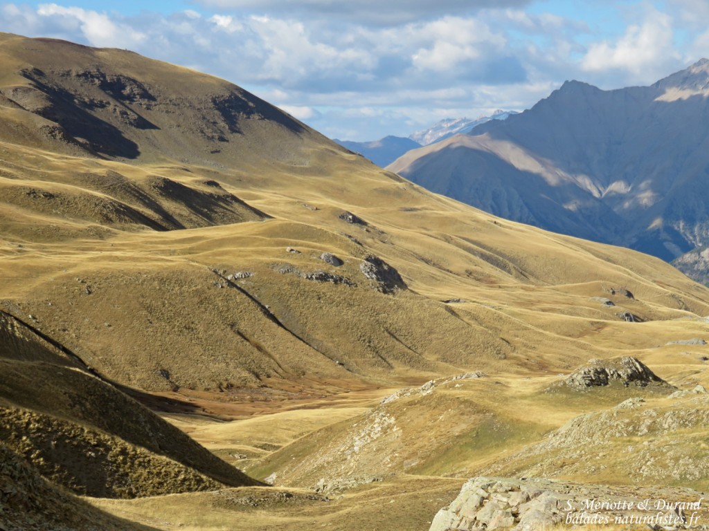 Nous roulons jusqu’au hameau de Bayasse à l’entrée du Parc National du Mercantour et empruntons le GR56 en direction du col de la Moutière. Les paysages sont grandioses, mais malheureusement les ongulés semblent encore sur les hauteurs et nous n’observerons pas un seul chamois ! Les marmottes, quant à elles sont déjà au fond de leur terrier et ont entamé leur sommeil hivernal. L’ambiance est bien calme ! Seuls les groupes de turdidés à la sortie du hameau s’activent. Les Merles à plastron et les Grives draines ainsi que quelques litornes se concentrent autour des sorbiers.