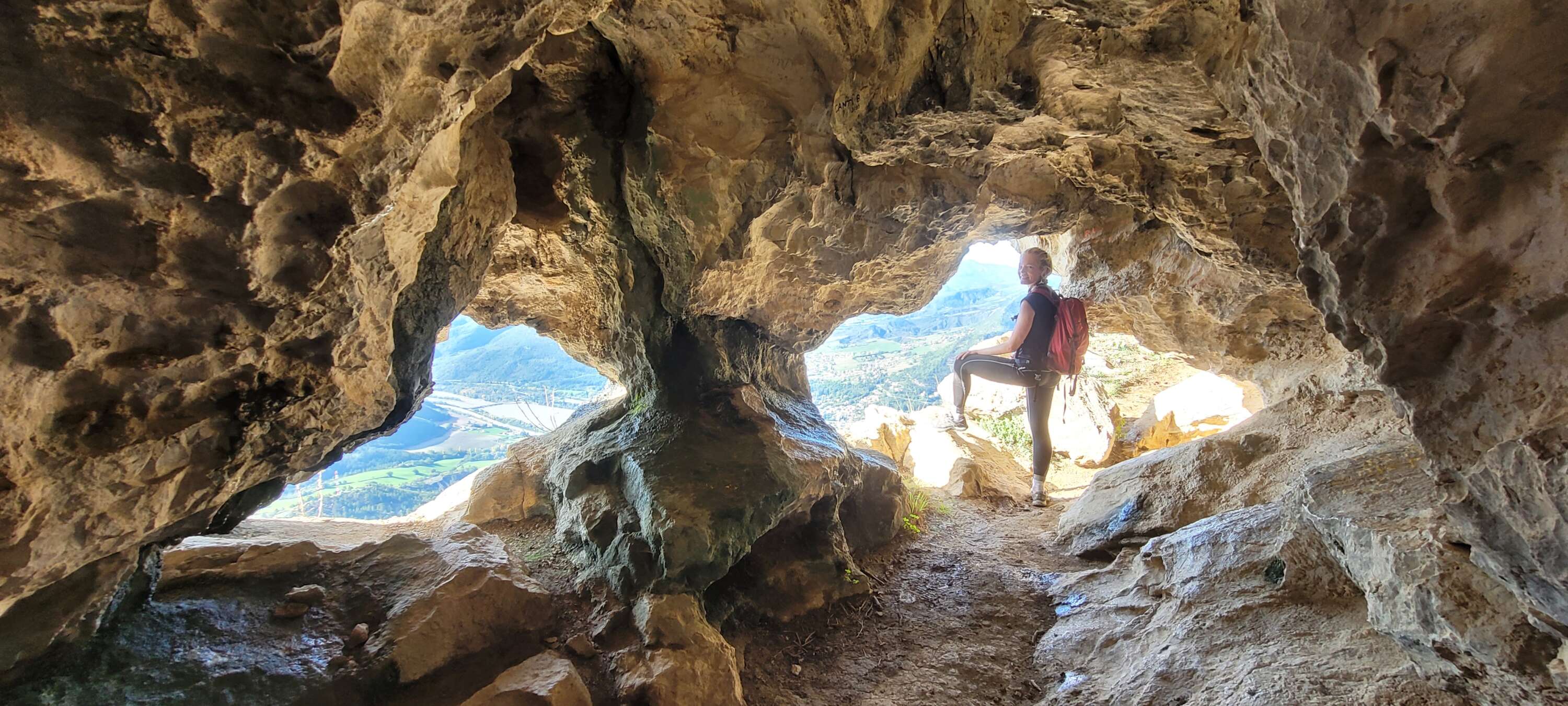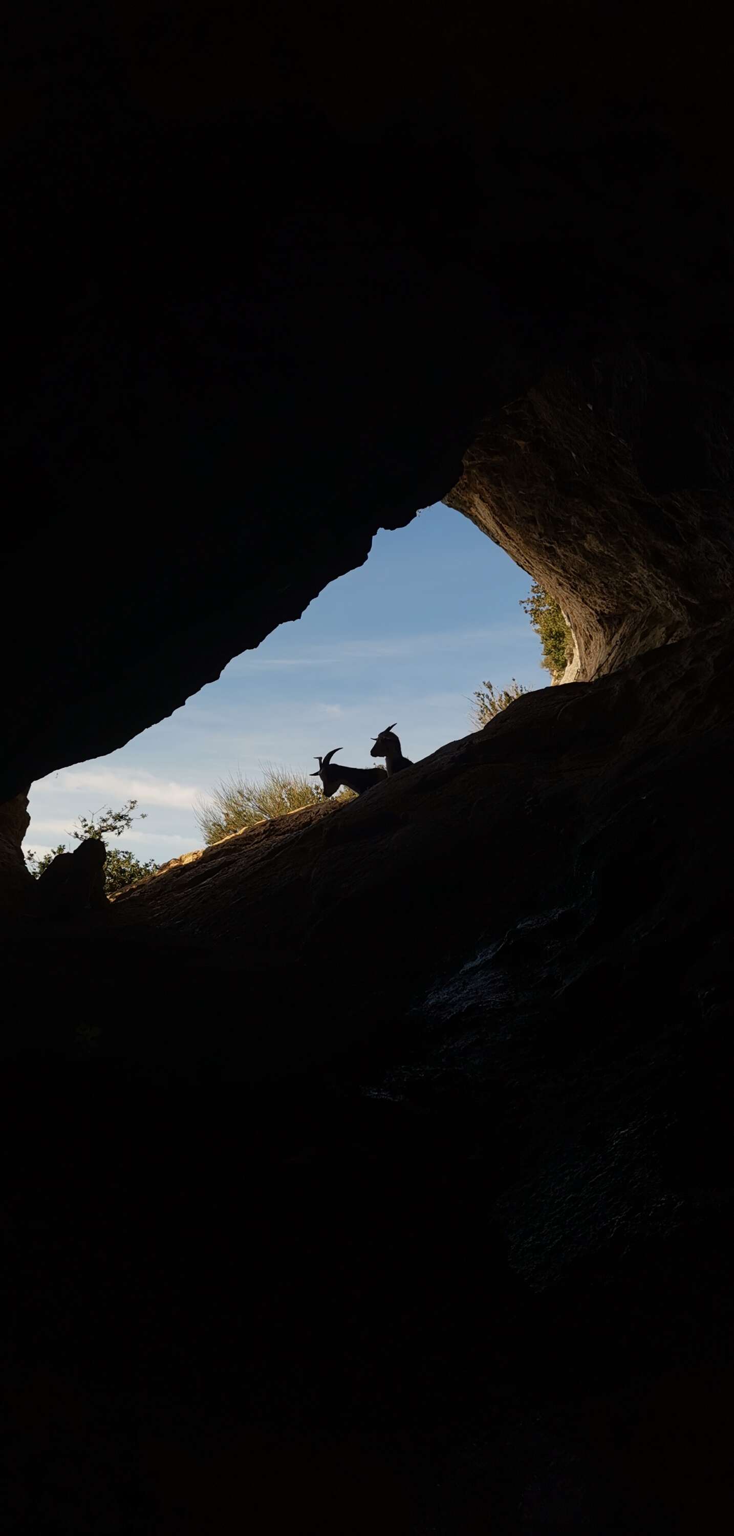 Pour continuer la balade, il faut traverser la caverne. Pensez donc à embarquer une lampe frontale pour ce petit passage qui débouche sur un véritable balcon au-dessus de Sisteron. Le plafond de la grotte est assez bas, attention à la tête ! Deux chèvres nous attendent à la sortie du tunnel et nous suivent un petit moment.