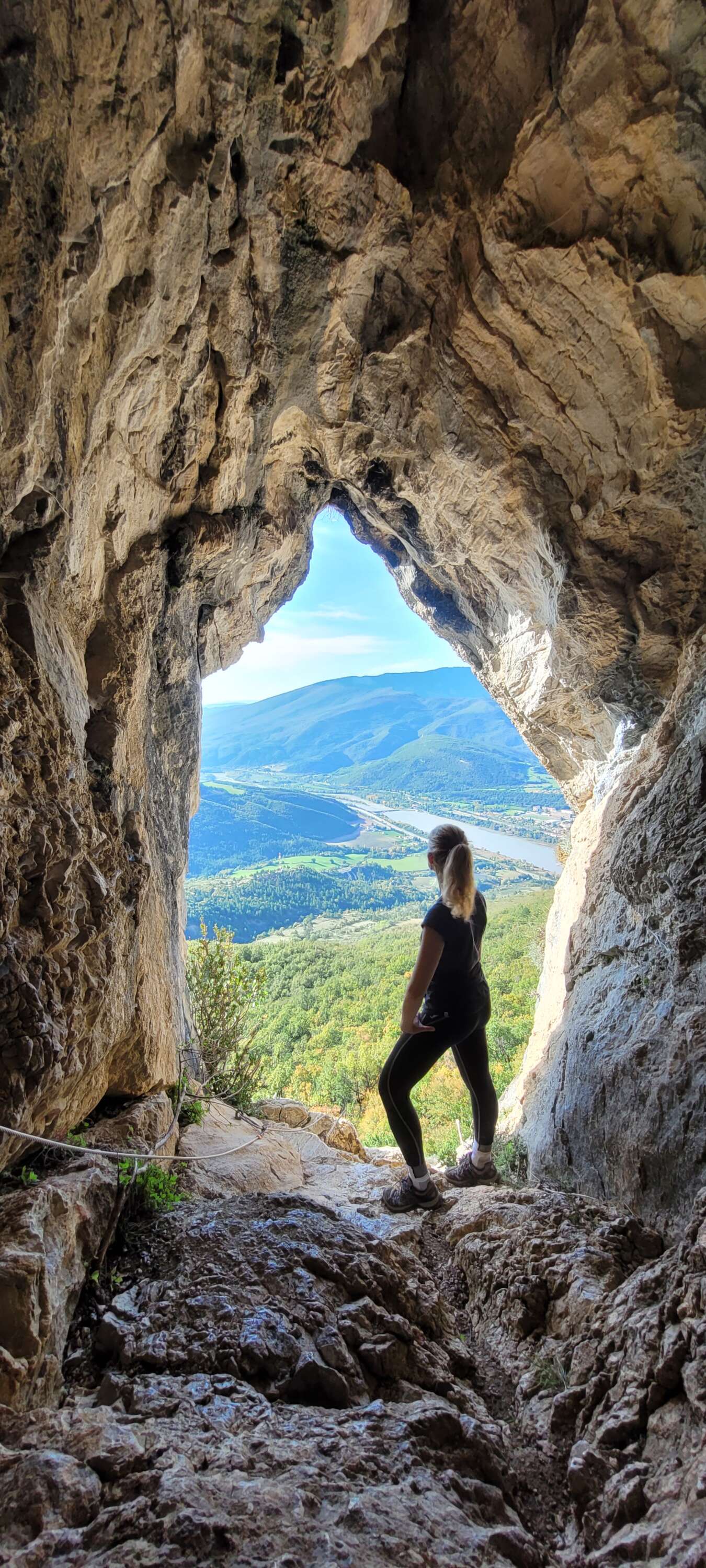 Nous voilà dans le domaine des craves et des faucons pèlerins. La rando devient un peu plus "technique". Certes, ce n'est pas de l'escalade, mais il faut s'agripper aux échelles et aux câbles pour atteindre l'entrée de la grotte. Passage un peu délicat, je déconseille fortement de venir ici avec des enfants ! Mais la montée vaut l'effort. La vue sur la vallée est grandiose, dans un cadre plutôt original ! Pause idéale pour le café.