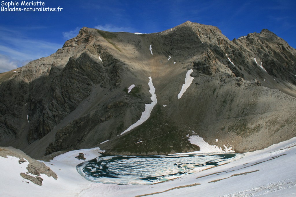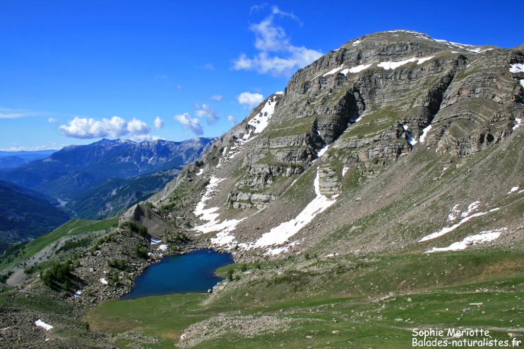 Cette petite rando permet de parcourir les pentes occidentales du Lac d’Allos, recouvertes de pelouses où les marmottes sont très abondantes. Quelques Traquets motteux se perchent en évidence sur les blocs rocheux au détour du sentier tandis qu’un Faucon crécerelle fait du surplace à la recherche d’un micromammifère ou d’un criquet. Une courte ascension permet d’atteindre le Col des Encombrettes (2527 m). Il est temps de faire une petite pause bien méritée tandis qu’un Aigle royal, bientôt suivi par une dizaine de Vautours fauves, profite des premiers thermiques pour filer le long des cimes. Il est possible de grimper sur la Petite Tour (2693 m) au milieu de gros blocs rocheux où se dissimulent deux Lagopèdes alpins qui décollent au passage d’un randonneur tandis qu’un jeune mâle de Bouquetin des Alpes, immobile, se dorant au soleil allongé sur son promontoire, passe inaperçu.