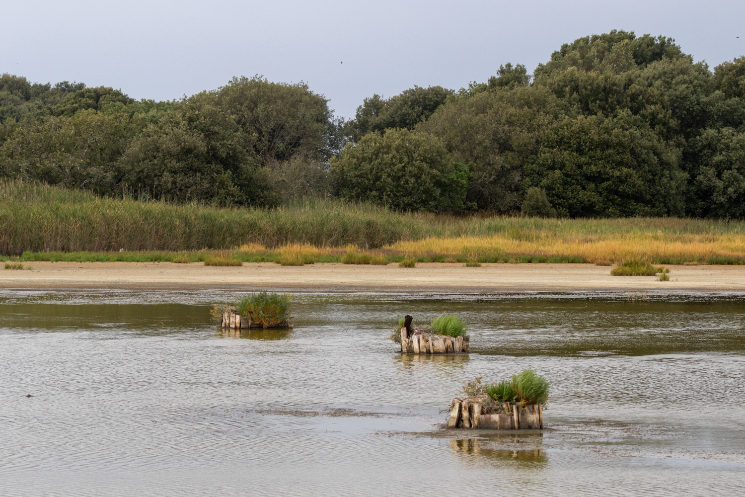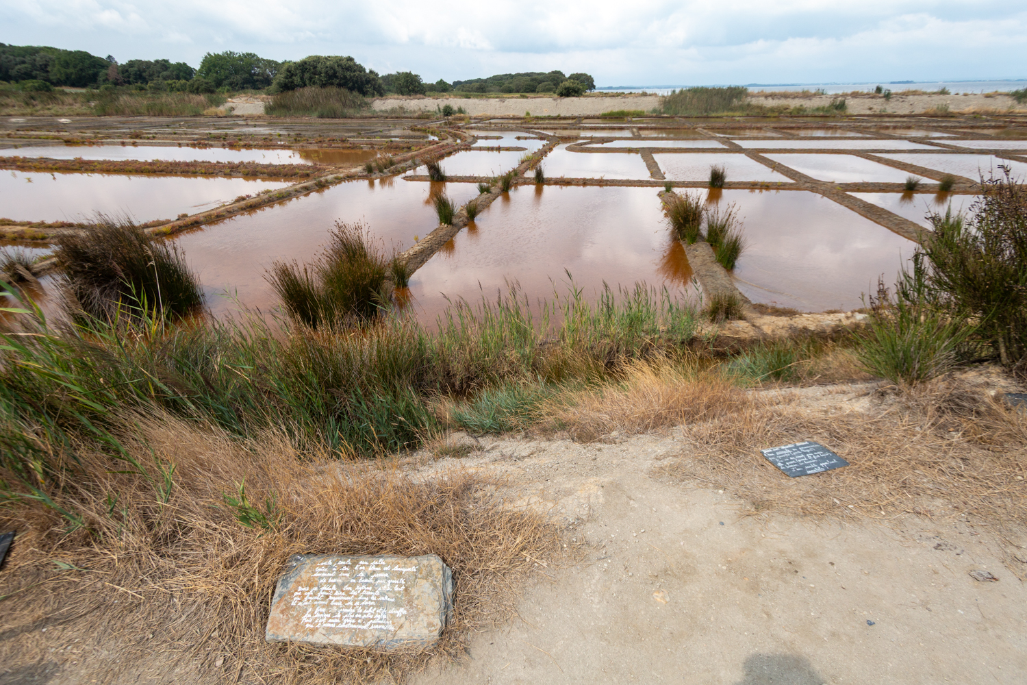 Après avoir fait un petit tour dans les salins, nous nous garons au bout de la route, en face de l’île de Tascon.